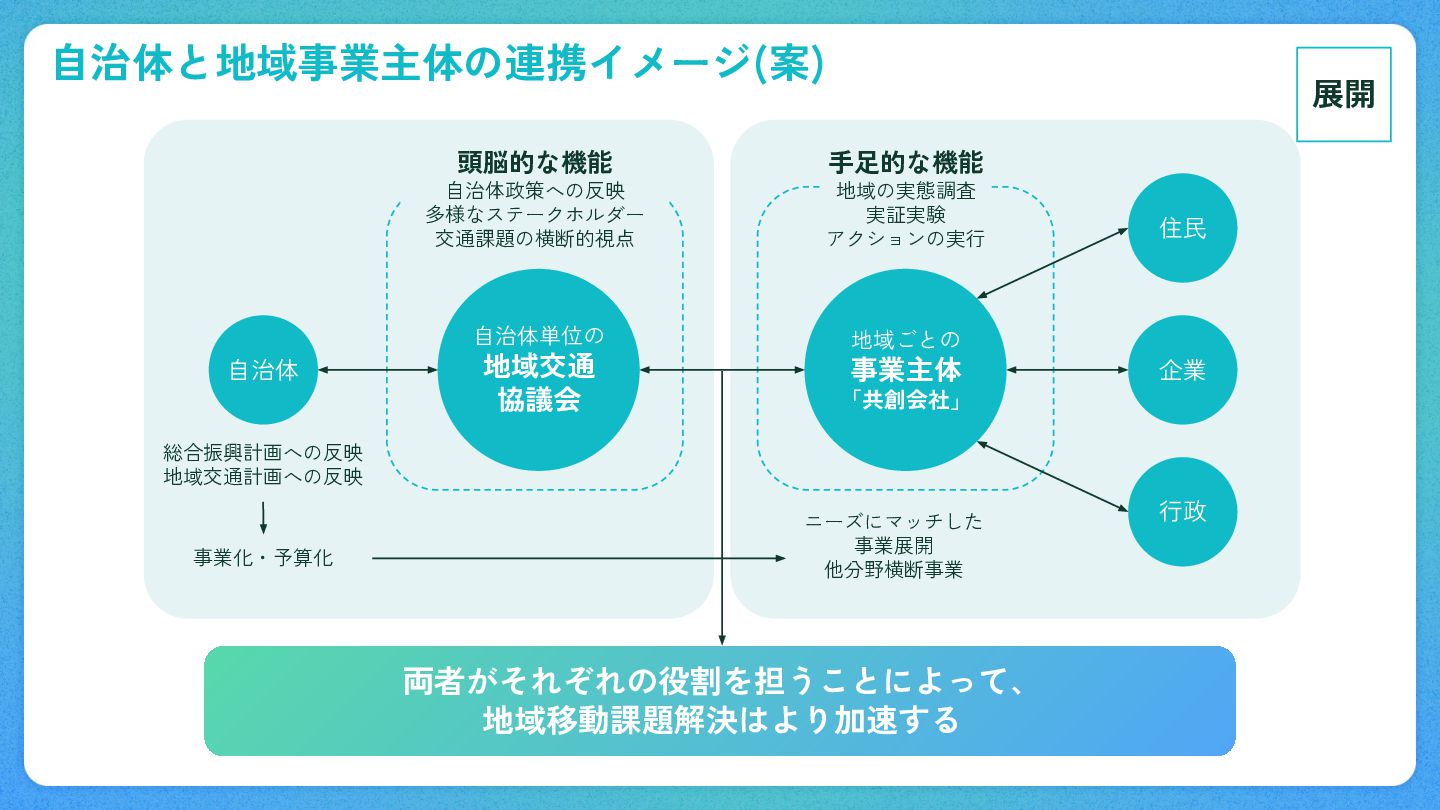 自治体と地域事業主体の連携イメージ(案) 展開 自治体単位の 地域交通 協議会 地域ごとの 事業主体 「共創会社」 両者がそれぞれの役割を担うことによって、 地域移動課題解決はより加速する