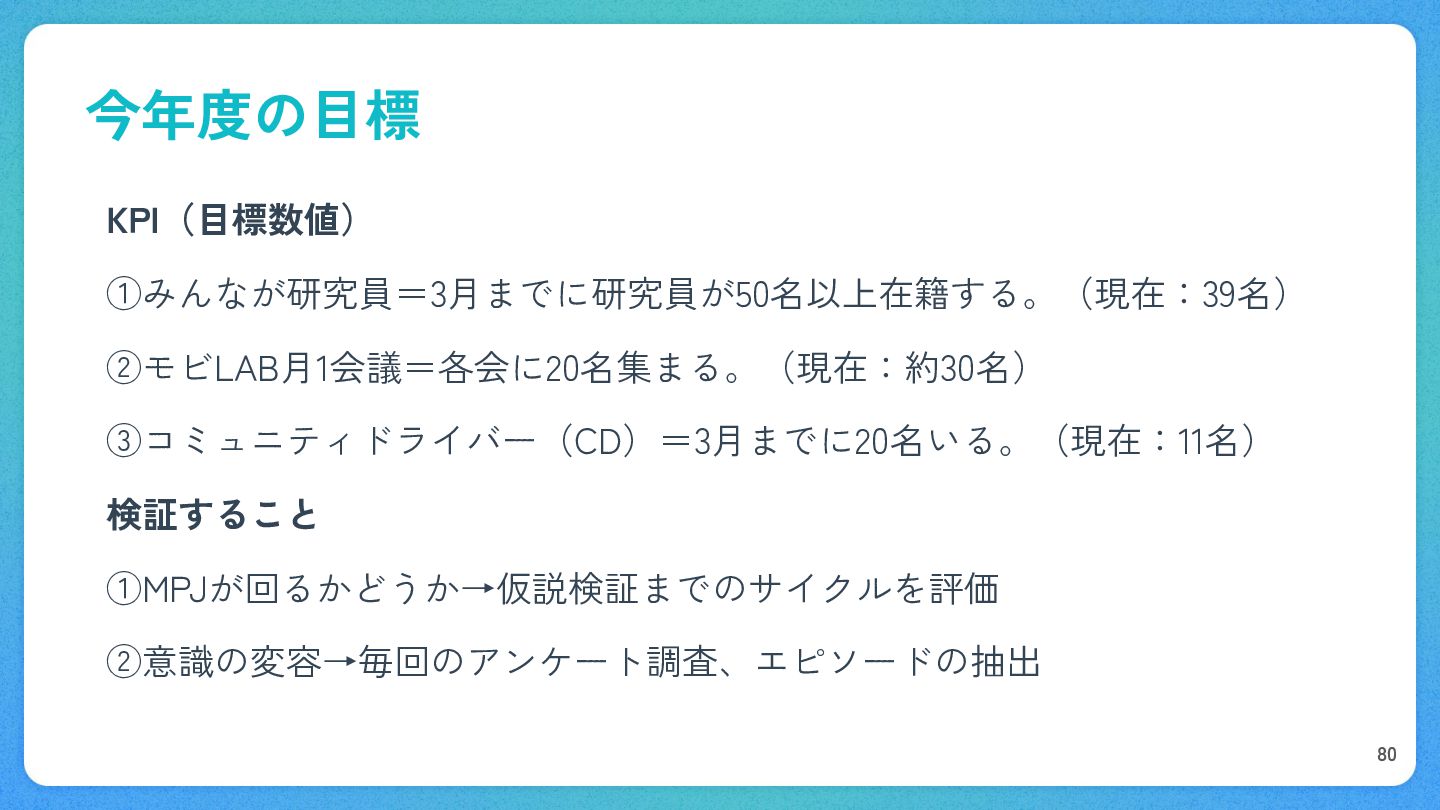 今年度の目標 KPI(目標数値) ①みんなが研究員=3月までに研究員が50名以上在籍する。(現在:39名) ②モビLAB月1会議=各会に20名集まる。(現在:約30名) ③コミュニティドライバー(CD)=3月までに20名いる。(現在:11名) 検証すること ①MPJが回るかどうか→仮説検証までのサイクルを評価 ②意識の変容→毎回のアンケート調査、エピソードの抽出 80