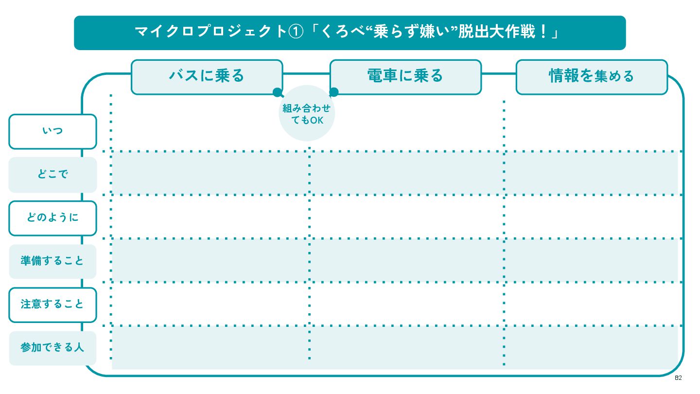 82 マイクロプロジェクト①「くろべ“乗らず嫌い”脱出大作戦!」 バスに乗る 電車に乗る 情報を集める いつ どこで どのように 準備すること 注意すること