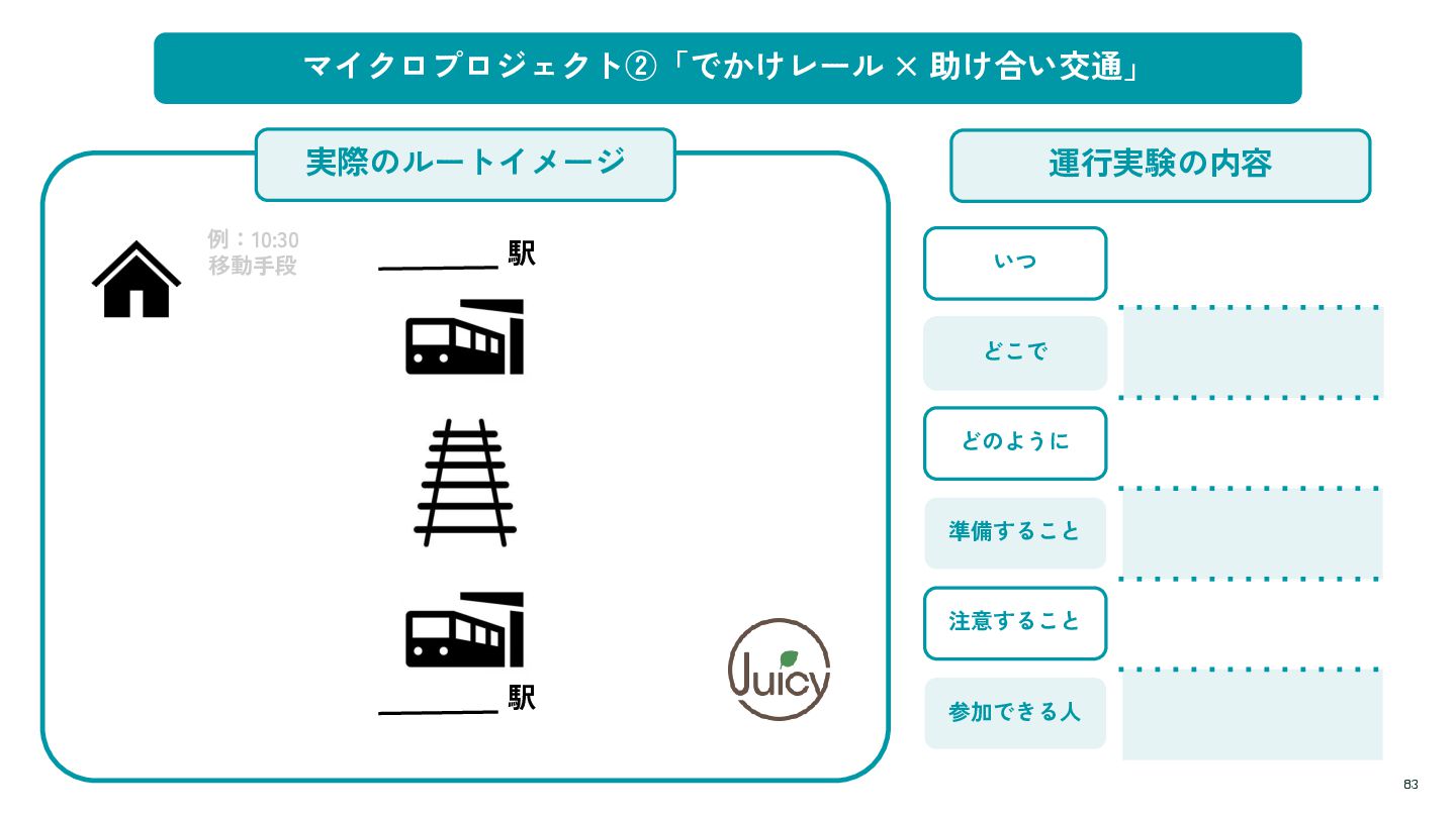 83 マイクロプロジェクト②「でかけレール × 助け合い交通」 実際のルートイメージ いつ どこで どのように 準備すること 注意すること