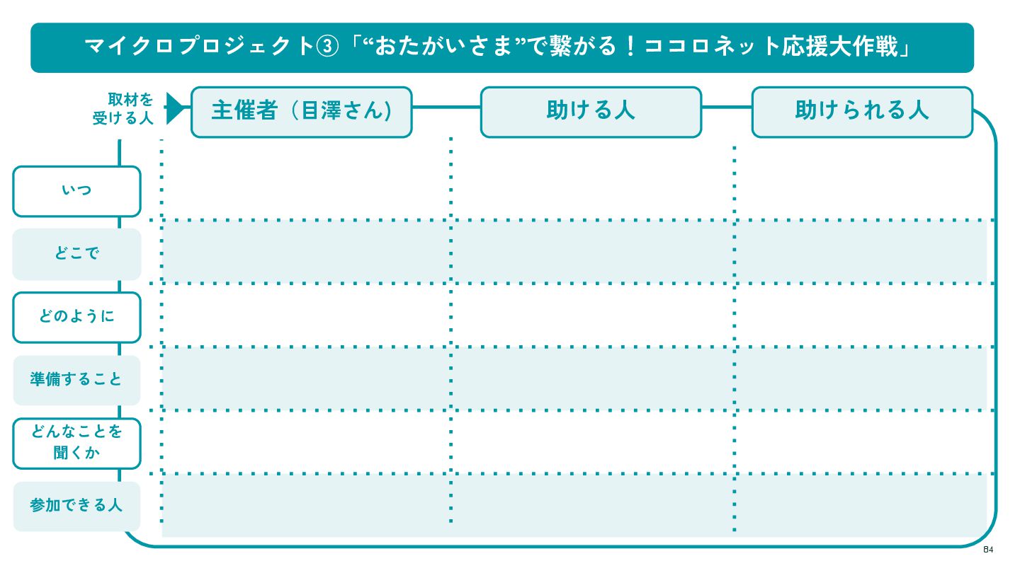84 マイクロプロジェクト③「“おたがいさま”で繋がる!ココロネット応援大作戦」 主催者(目澤さん) 助ける人 助けられる人 いつ どこで どのように 準備すること どんなことを