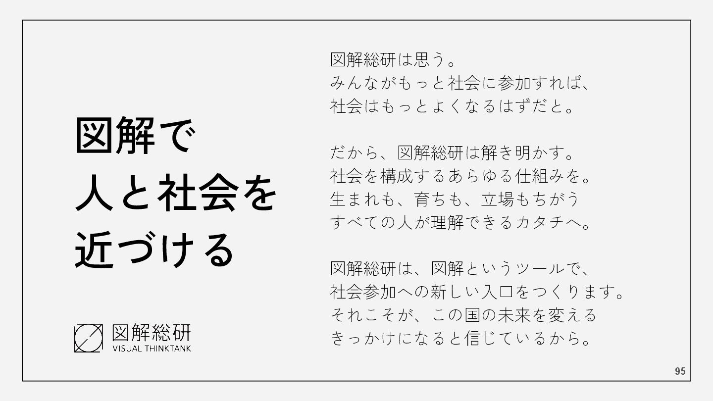 図解総研は、図解というツールで、 社会参加への新しい入口をつくります。 それこそが、この国の未来を変える きっかけになると信じているから。 95