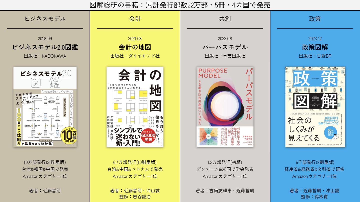 台湾&中国&ベトナムで発売 Amazonカテゴリー1位 出版社:学芸出版社 パーパスモデル 2022.08 1.2万部発行(初版) 出版社:日経BP 政策図解 2023.12 監修:岩谷誠治 著者:近藤哲朗・沖山誠 著者:近藤哲朗 著者:吉備友理恵・近藤哲朗 著者:近藤哲朗・沖山誠 監修:鈴木寛 ビジネスモデル 会計 共創 政策 Amazonカテゴリー1位 デンマーク&米国で学会発表 Amazonカテゴリー1位 経産省&総務省&文科省で研修 6千部発行(2刷重版) 図解総研の書籍:累計発行部数22万部・5冊・4カ国で発売