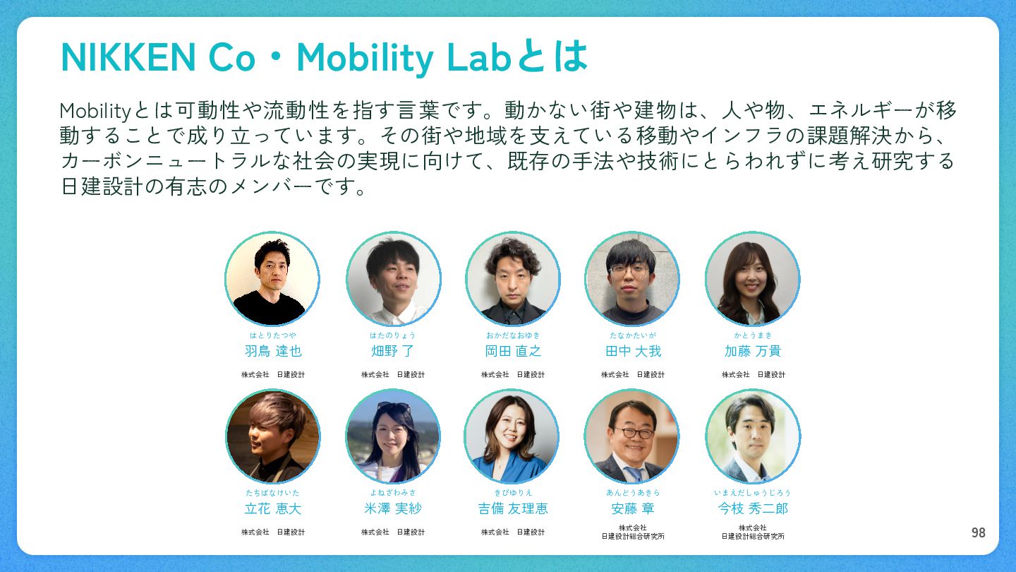98 NIKKEN Co・Mobility Labとは Mobilityとは可動性や流動性を指す言葉です。動かない街や建物は、人や物、エネルギーが移 動することで成り立っています。その街や地域を支えている移動やインフラの課題解決から、 カーボンニュートラルな社会の実現に向けて、既存の手法や技術にとらわれずに考え研究する 日建設計の有志のメンバーです。 加藤 万貴