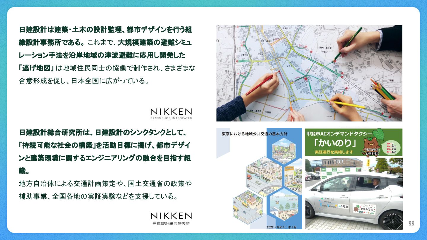 99 日建設計は建築・土木の設計監理、都市デザインを行う組 織設計事務所である。 これまで、大規模建築の避難シミュ レーション手法を沿岸地域の津波避難に応用し開発した 「逃げ地図」 は地域住民同士の協働で制作され、さまざまな 合意形成を促し、日本全国に広がっている。 日建設計総合研究所は、日建設計のシンクタンクとして、 「持続可能な社会の構築」を活動目標に掲げ、都市デザイ
