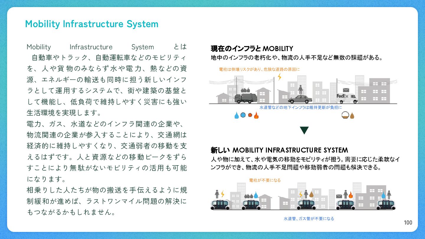 100 Mobility Infrastructure System とは 自動車やトラック、自動運転車などのモビリティ を、人や貨 物のみならず水や電 力、熱などの資 源、エネルギーの輸送も同時に担う新しいインフ
