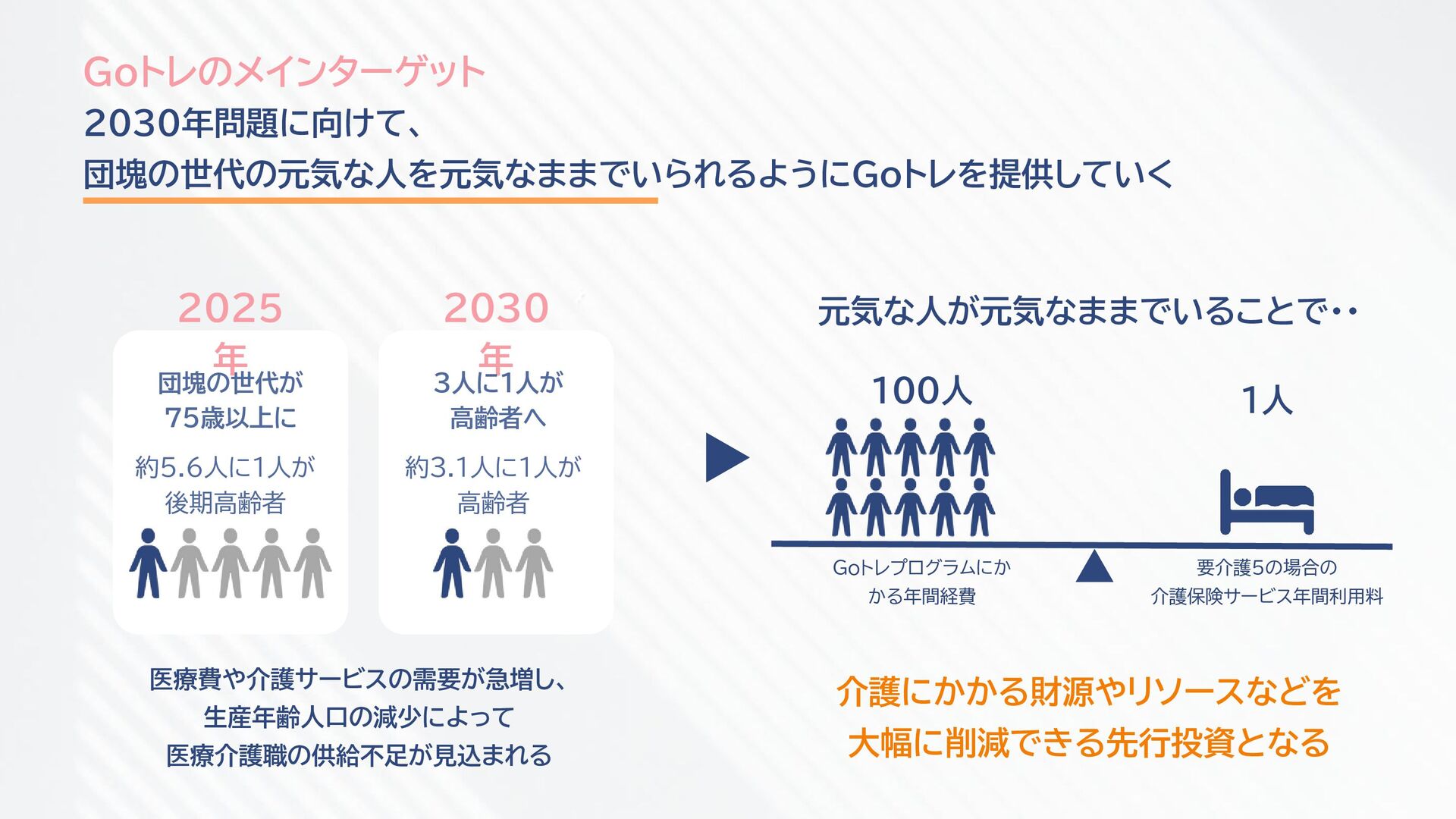 2030年問題に向けて、 団塊の世代の元気な人を元気なままでいられるようにGoトレを提供していく Goトレのメインターゲット 2025 年 2030 年 団塊の世代が 75歳以上に 約5.6人に1人が