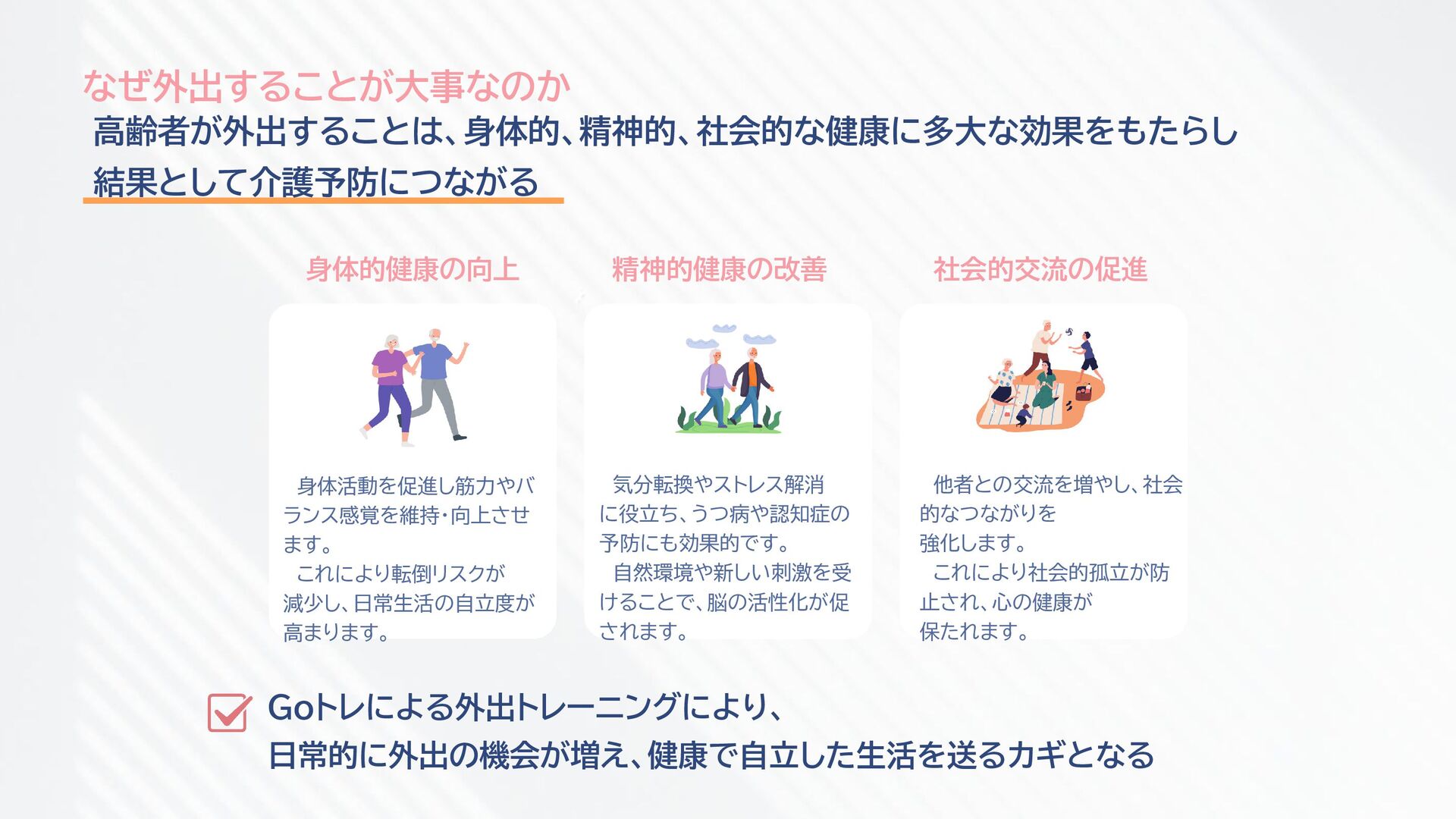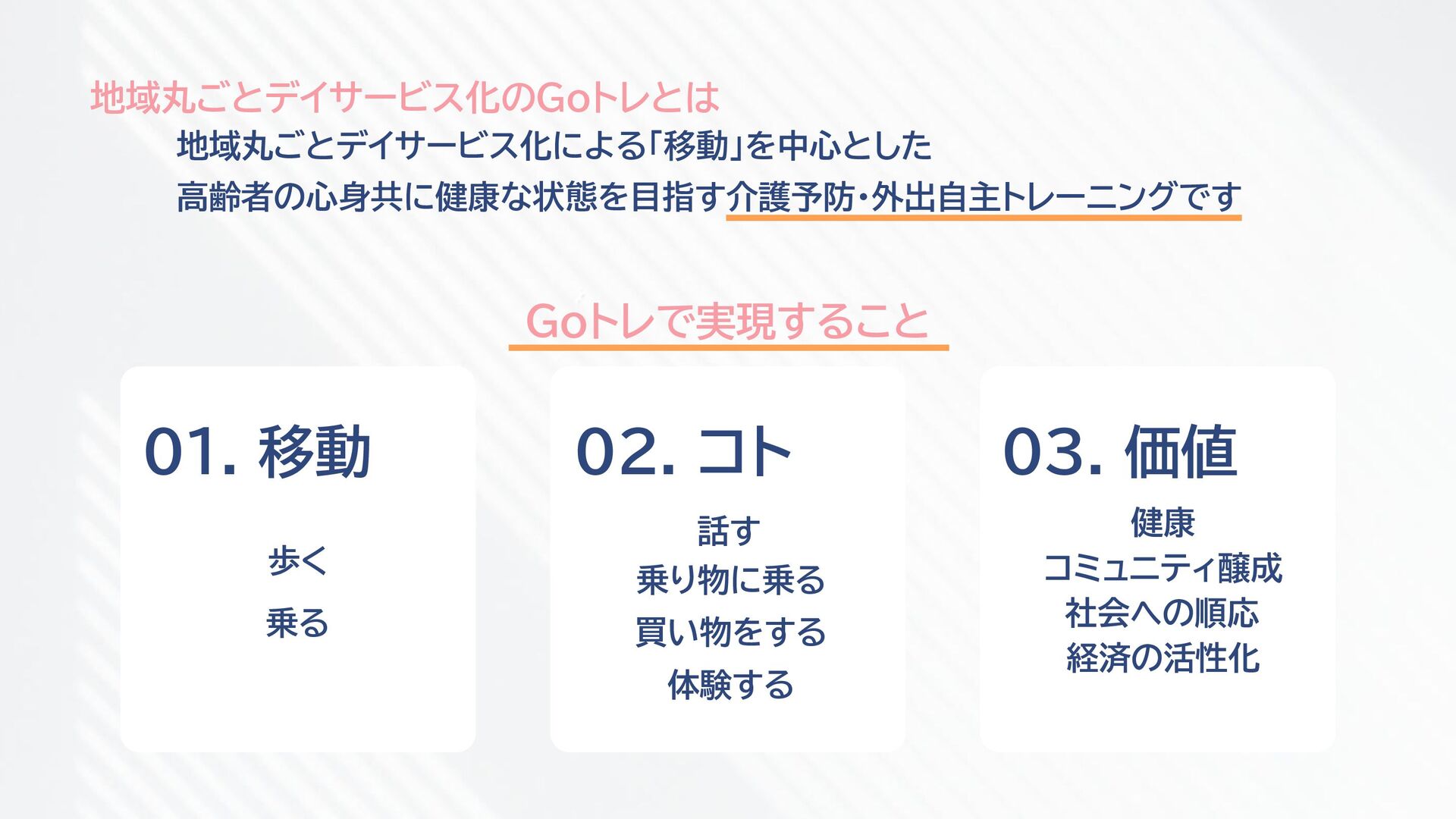 地域丸ごとデイサービス化による「移動」を中心とした 高齢者の心身共に健康な状態を目指す介護予防・外出自主トレーニングです 地域丸ごとデイサービス化のGoトレとは 01. 移動 02. コト 03. 価値 歩く