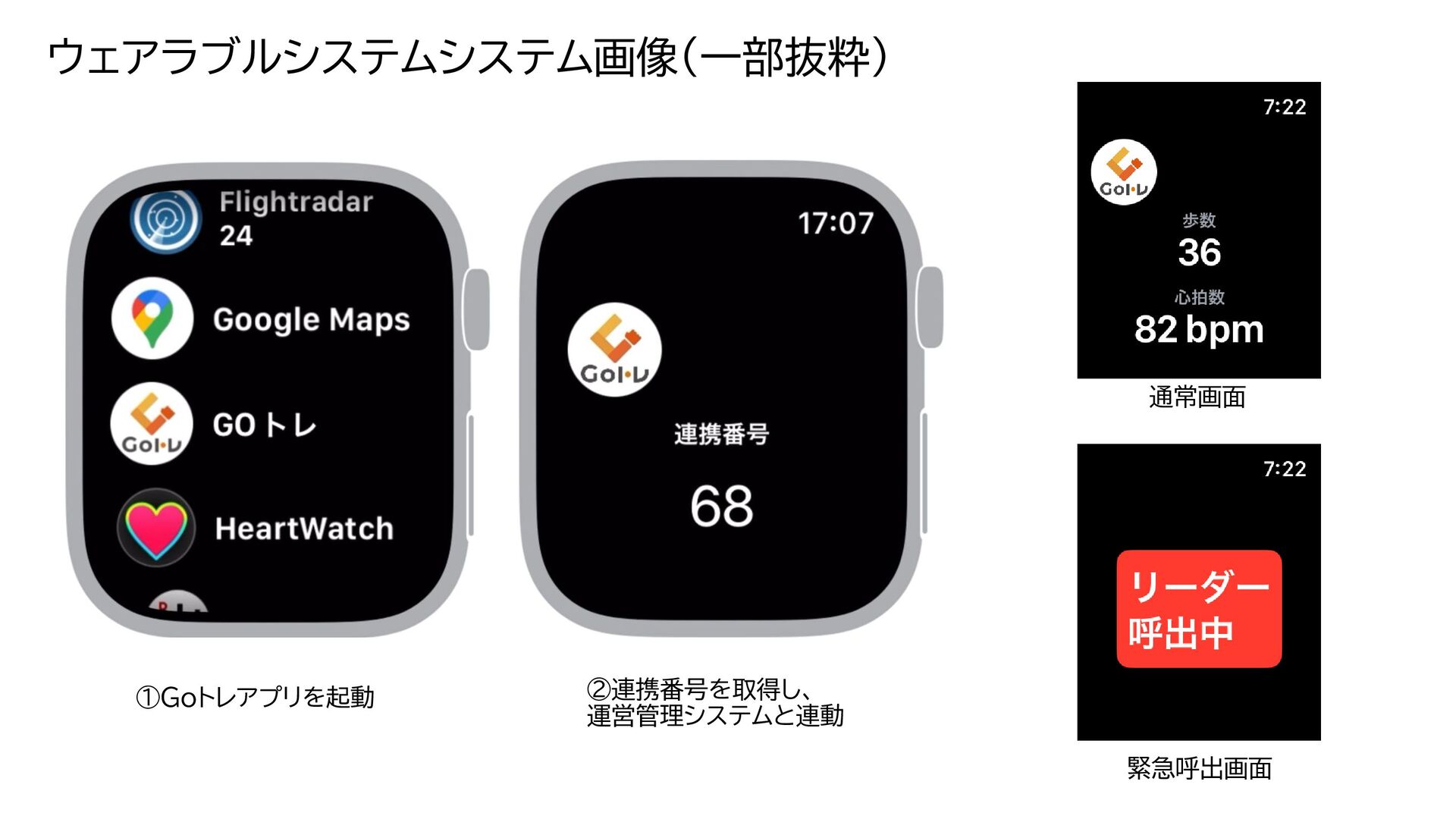 ウェアラブルシステムシステム画像(一部抜粋) ①Goトレアプリを起動 ②連携番号を取得し、 運営管理システムと連動 通常画面 緊急呼出画面
