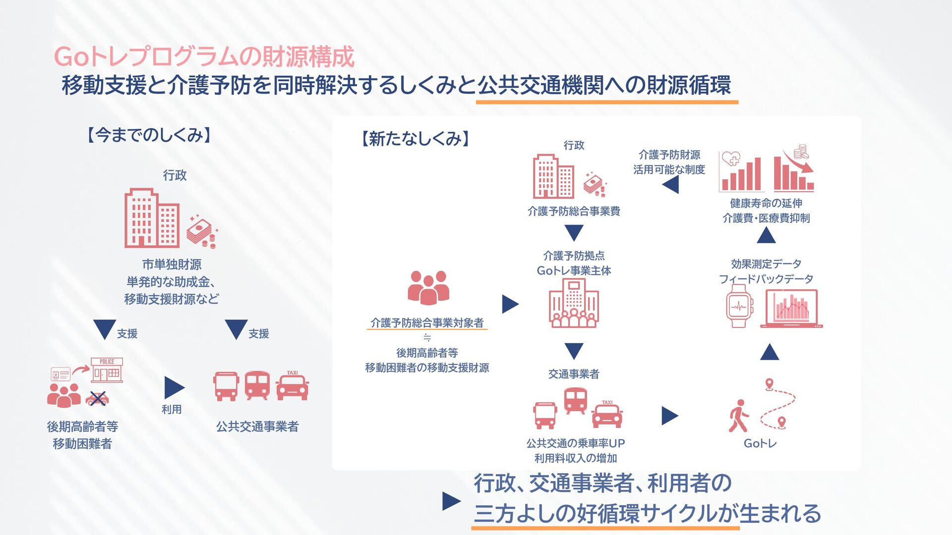 単発的な助成金、 移動支援財源など 公共交通事業者 介護予防総合事業費 介護予防拠点 Goトレ事業主体 行政 交通事業者 公共交通の乗車率UP 利用料収入の増加 【新たなしくみ】 行政 Goトレ 効果測定データ フィードバックデータ 健康寿命の延伸 介護費・医療費抑制 介護予防財源 活用可能な制度 行政、交通事業者、利用者の 三方よしの好循環サイクルが生まれる 支援 支援 利用