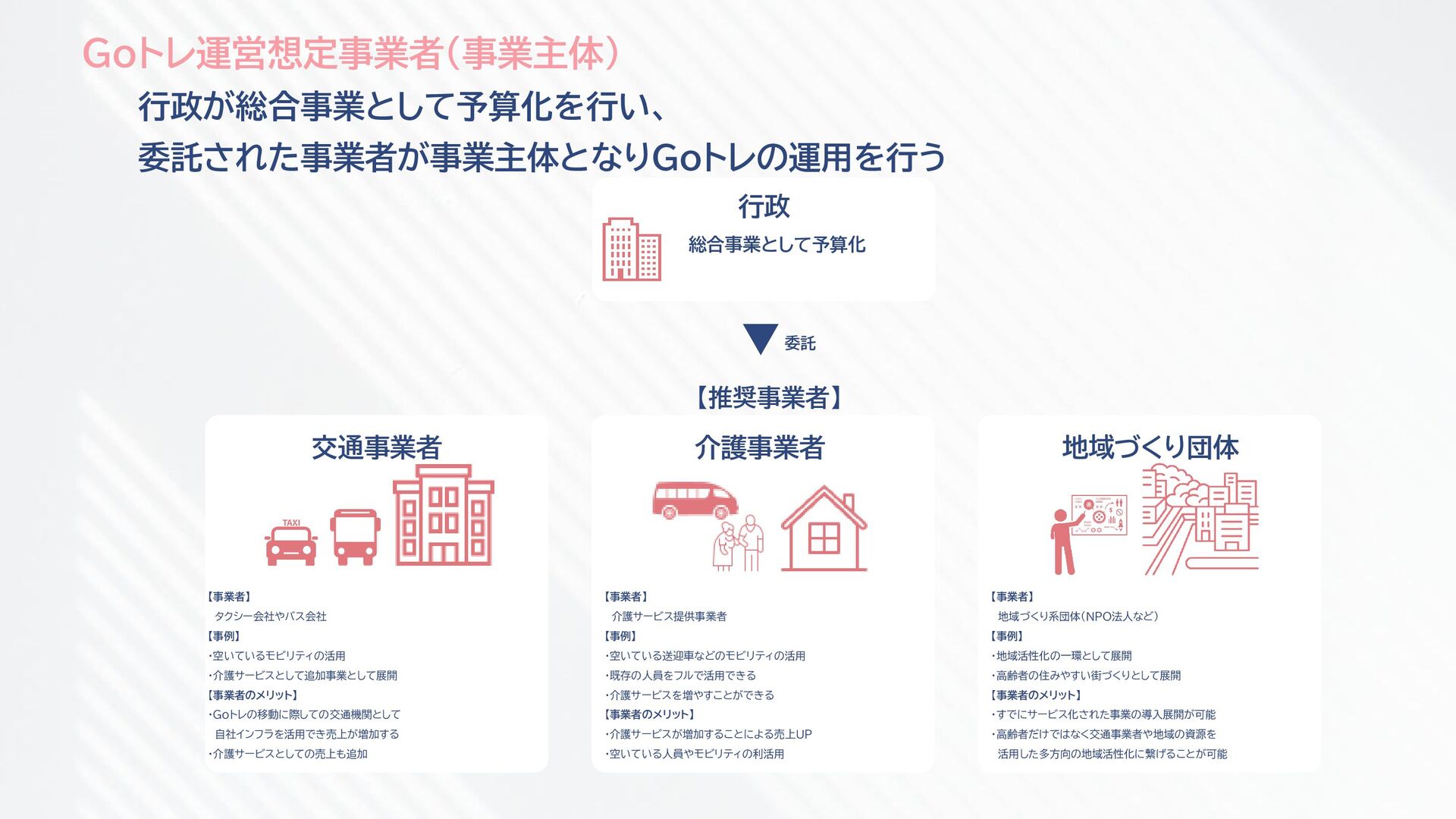 【事業者のメリット】 ・Goトレの移動に際しての交通機関として 自社インフラを活用でき売上が増加する ・介護サービスとしての売上も追加 介護事業者 【事業者】 介護サービス提供事業者 【事例】 ・空いている送迎車などのモビリティの活用 ・既存の人員をフルで活用できる ・介護サービスを増やすことができる 【事業者のメリット】 ・介護サービスが増加することによる売上UP ・空いている人員やモビリティの利活用 地域づくり団体 【事業者】 地域づくり系団体(NPO法人など) 【事例】 ・地域活性化の一環として展開 ・高齢者の住みやすい街づくりとして展開 【事業者のメリット】 ・すでにサービス化された事業の導入展開が可能 ・高齢者だけではなく交通事業者や地域の資源を 活用した多方向の地域活性化に繋げることが可能 行政 総合事業として予算化 委託