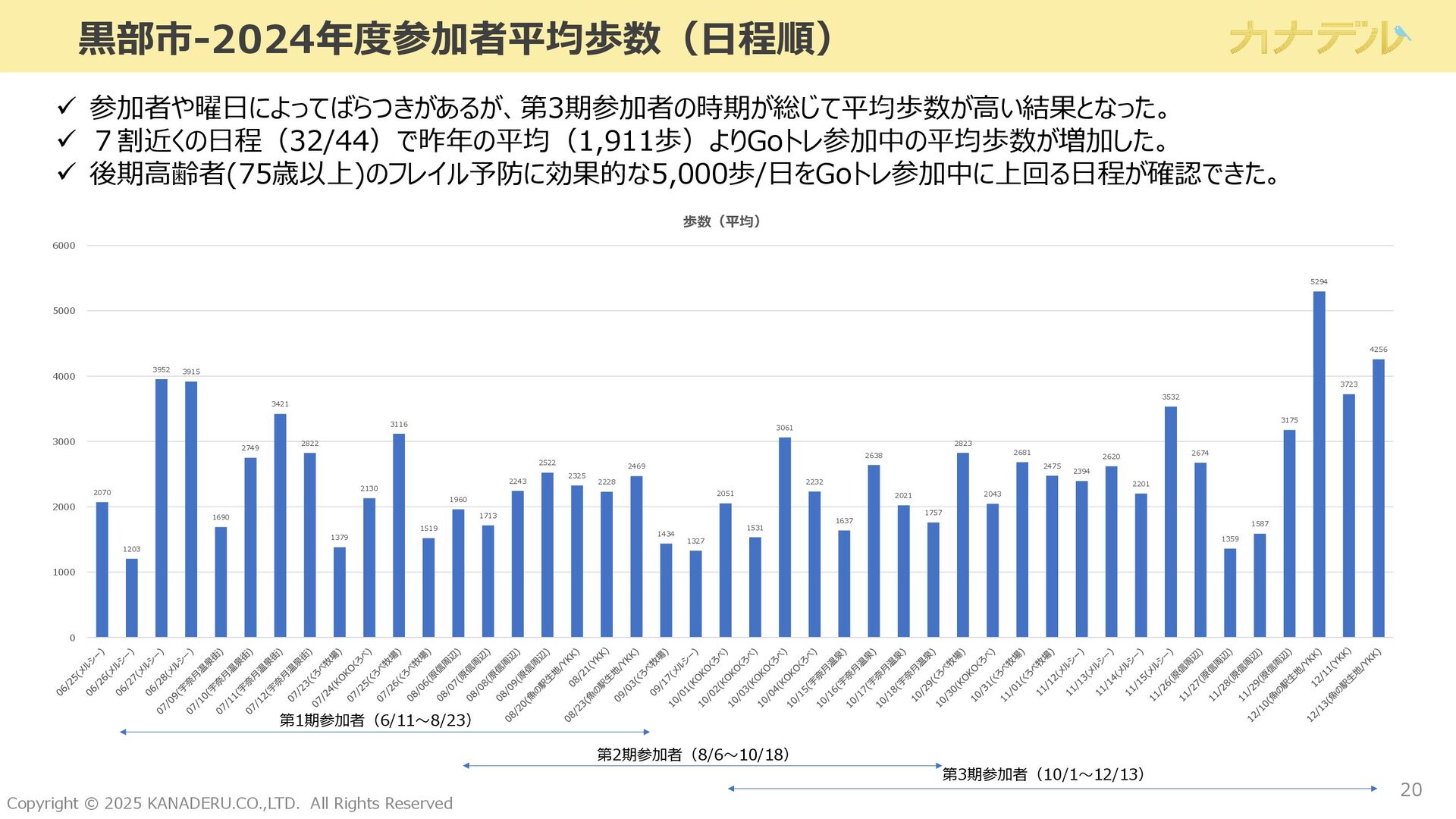 3952 3915 1690 2749 3421 2822 1379 2130 3116 1519 1960 1713 2243 2522 2325 2228 2469 1434 1327 2051 1531 3061 2232 1637 2638 2021 1757 2823 2043 2681 2475 2394 2620 2201 3532 2674 1359 1587 3175 5294 3723 4256 0 1000 2000 3000 4000 5000 6000 歩数(平均) 黒部市-2024年度参加者平均歩数(日程順) ✓ 参加者や曜日によってばらつきがあるが、第3期参加者の時期が総じて平均歩数が高い結果となった。 ✓ 7割近くの日程(32/44)で昨年の平均(1,911歩)よりGoトレ参加中の平均歩数が増加した。 ✓ 後期高齢者(75歳以上)のフレイル予防に効果的な5,000歩/日をGoトレ参加中に上回る日程が確認できた。 第1期参加者(6/11~8/23) 第2期参加者(8/6~10/18) 第3期参加者(10/1~12/13)