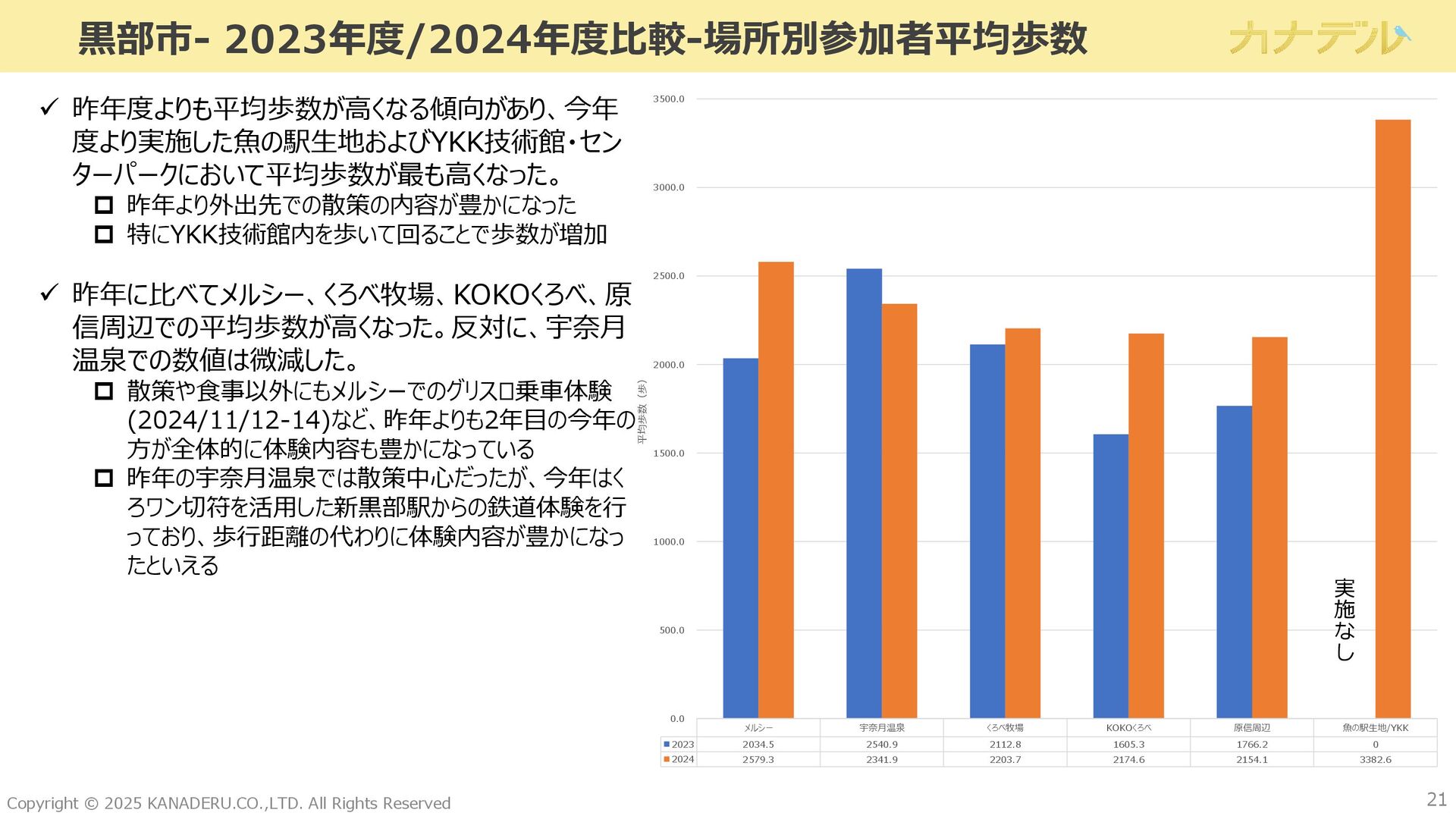 くろべ牧場 KOKOくろべ 原信周辺 魚の駅生地/YKK 2023 2034.5 2540.9 2112.8 1605.3 1766.2 0 2024 2579.3 2341.9 2203.7 2174.6 2154.1 3382.6 0.0 500.0 1000.0 1500.0 2000.0 2500.0 3000.0 3500.0 平均歩数(歩) 黒部市- 2023年度/2024年度比較-場所別参加者平均歩数 実 施 な し ✓ 昨年度よりも平均歩数が高くなる傾向があり、今年 度より実施した魚の駅生地およびYKK技術館・セン ターパークにおいて平均歩数が最も高くなった。 昨年より外出先での散策の内容が豊かになった 特にYKK技術館内を歩いて回ることで歩数が増加 ✓ 昨年に比べてメルシー、くろべ牧場、KOKOくろべ、原 信周辺での平均歩数が高くなった。反対に、宇奈月 温泉での数値は微減した。 散策や食事以外にもメルシーでのグリスロ乗車体験 (2024/11/12-14)など、昨年よりも2年目の今年の 方が全体的に体験内容も豊かになっている 昨年の宇奈月温泉では散策中心だったが、今年はく ろワン切符を活用した新黒部駅からの鉄道体験を行 っており、歩行距離の代わりに体験内容が豊かになっ たといえる