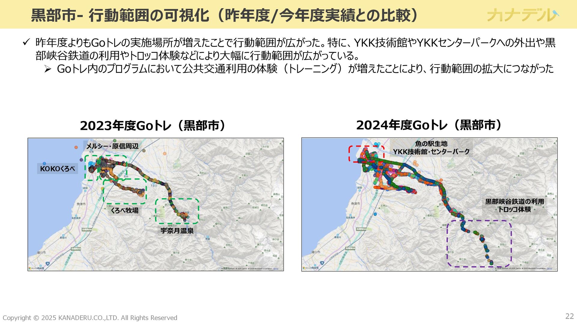 Copyright © 2025 KANADERU.CO.,LTD. All Rights Reserved 22 黒部市- 行動範囲の可視化(昨年度/今年度実績との比較)