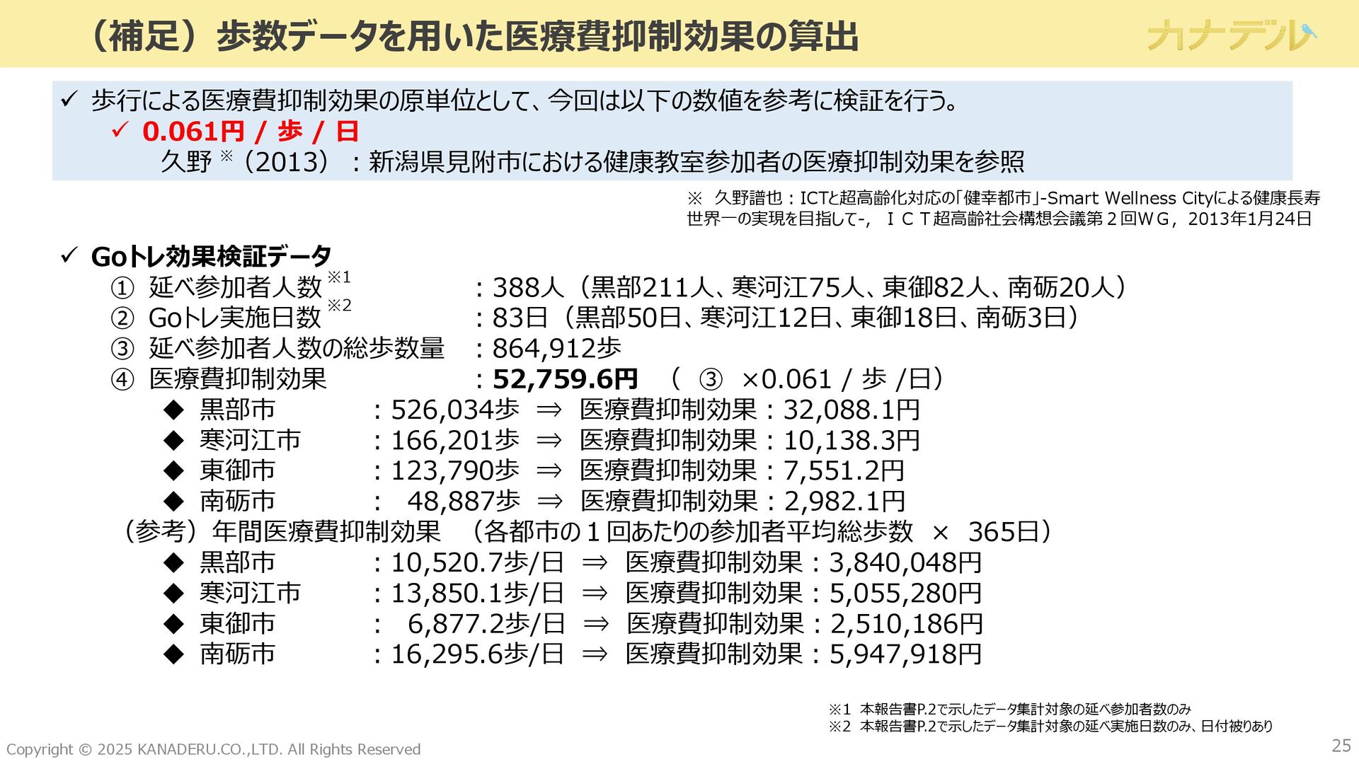 久野 (2013):新潟県見附市における健康教室参加者の医療抑制効果を参照 ※ 久野譜也:ICTと超高齢化対応の「健幸都市」-Smart Wellness Cityによる健康長寿 世界一の実現を目指して-,ICT超高齢社会構想会議第2回WG,2013年1月24日 ※ ✓ Goトレ効果検証データ ① 延べ参加者人数 :388人(黒部211人、寒河江75人、東御82人、南砺20人) ② Goトレ実施日数 :83日(黒部50日、寒河江12日、東御18日、南砺3日) ③ 延べ参加者人数の総歩数量 :864,912歩 ④ 医療費抑制効果 :52,759.6円 ( ③ ×0.061 / 歩 /日) ◆ 黒部市 :526,034歩 ⇒ 医療費抑制効果:32,088.1円 ◆ 寒河江市 :166,201歩 ⇒ 医療費抑制効果:10,138.3円 ◆ 東御市 :123,790歩 ⇒ 医療費抑制効果:7,551.2円 ◆ 南砺市 : 48,887歩 ⇒ 医療費抑制効果:2,982.1円 (参考)年間医療費抑制効果 (各都市の1回あたりの参加者平均総歩数 × 365日) ◆ 黒部市 :10,520.7歩/日 ⇒ 医療費抑制効果:3,840,048円 ◆ 寒河江市 :13,850.1歩/日 ⇒ 医療費抑制効果:5,055,280円 ◆ 東御市 : 6,877.2歩/日 ⇒ 医療費抑制効果:2,510,186円 ◆ 南砺市 :16,295.6歩/日 ⇒ 医療費抑制効果:5,947,918円 ※1 ※2 ※1 本報告書P.2で示したデータ集計対象の延べ参加者数のみ ※2 本報告書P.2で示したデータ集計対象の延べ実施日数のみ、日付被りあり Copyright © 2025 KANADERU.CO.,LTD. All Rights Reserved