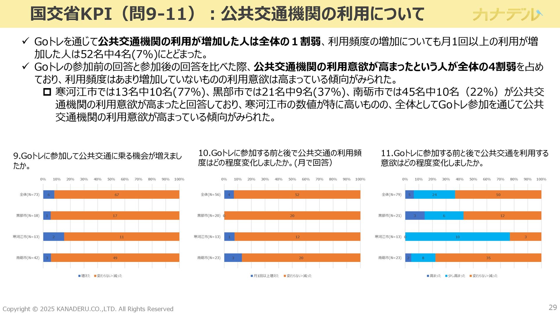 Copyright © 2025 KANADERU.CO.,LTD. All Rights Reserved 29 国交省KPI(問9-11):公共交通機関の利用について 9.Goトレに参加して公共交通に乗る機会が増えまし