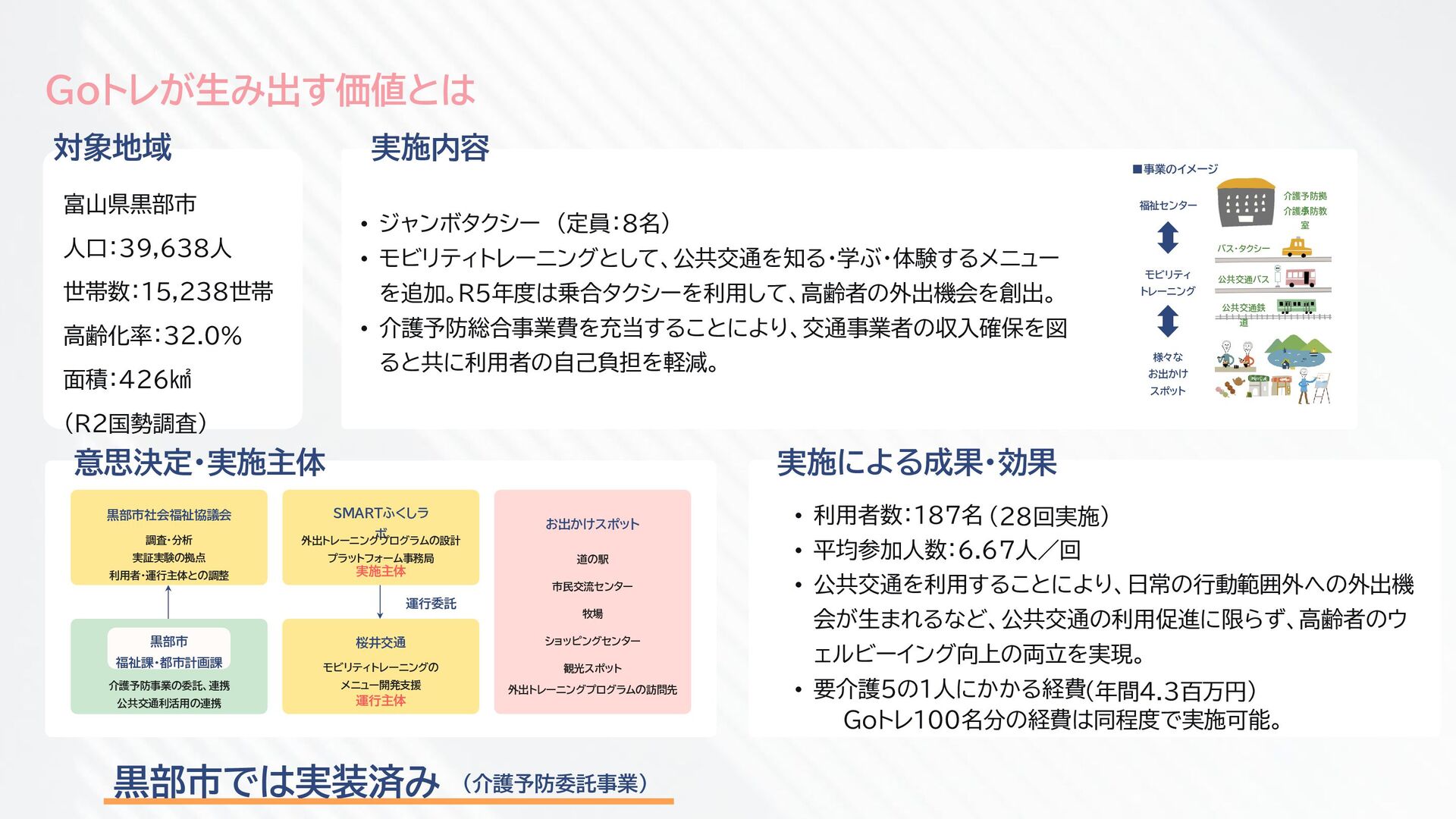 公共交通バス 公共交通鉄 道 介護予防拠 点 介護予防教 室 ▪事業のイメージ 福祉センター モビリティ トレーニング 様々な お出かけ スポット 実施内容 歩く 運行委託 SMARTふくしラ ボ 外出トレーニングプログラムの設計 プラットフォーム事務局 実施主体 調査・分析 実証実験の拠点 利用者・運行主体との調整 黒部市社会福祉協議会 桜井交通 運行主体 介護予防事業の委託、連携 公共交通利活用の連携 黒部市 福祉課・都市計画課 お出かけスポット 道の駅 市民交流センター 牧場 ショッピングセンター 観光スポット 外出トレーニングプログラムの訪問先 意思決定・実施主体 歩く 実施による成果・効果 • 利用者数:187名 • 平均参加人数:6.67人/回 • 公共交通を利用することにより、日常の行動範囲外への外出機 会が生まれるなど、公共交通の利用促進に限らず、高齢者のウ ェルビーイング向上の両立を実現。 • 要介護5の1人にかかる経費 (28回実施) (年間4.3百万円) Goトレ100名分の経費は同程度で実施可能。 Goトレが生み出す価値とは • ジャンボタクシー (定員:8名) • モビリティトレーニングとして、公共交通を知る・学ぶ・体験するメニュー を追加。R5年度は乗合タクシーを利用して、高齢者の外出機会を創出。 • 介護予防総合事業費を充当することにより、交通事業者の収入確保を図 ると共に利用者の自己負担を軽減。 黒部市では実装済み (介護予防委託事業) モビリティトレーニングの メニュー開発支援