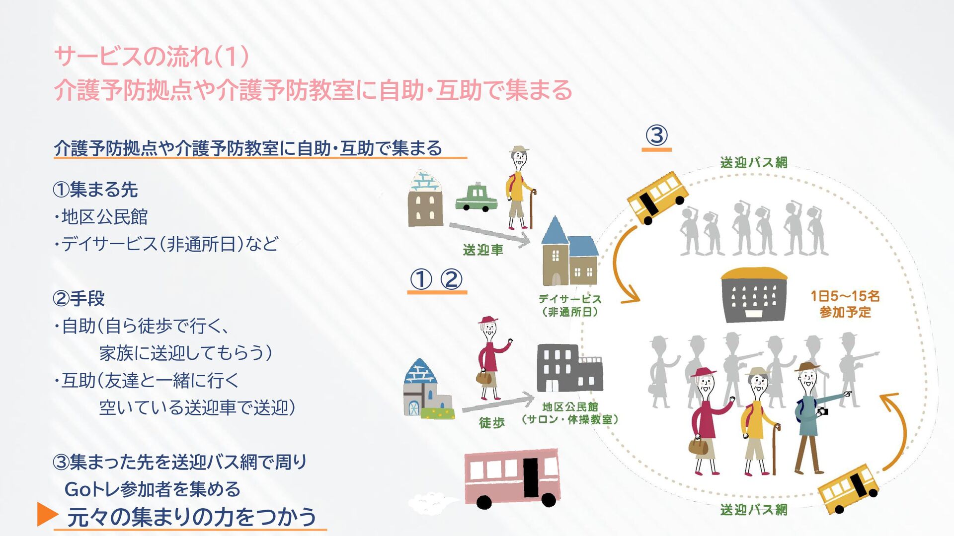 ③集まった先を送迎バス網で周り Goトレ参加者を集める ① ② ③ 介護予防拠点や介護予防教室に自助・互助で集まる 元々の集まりの力をつかう