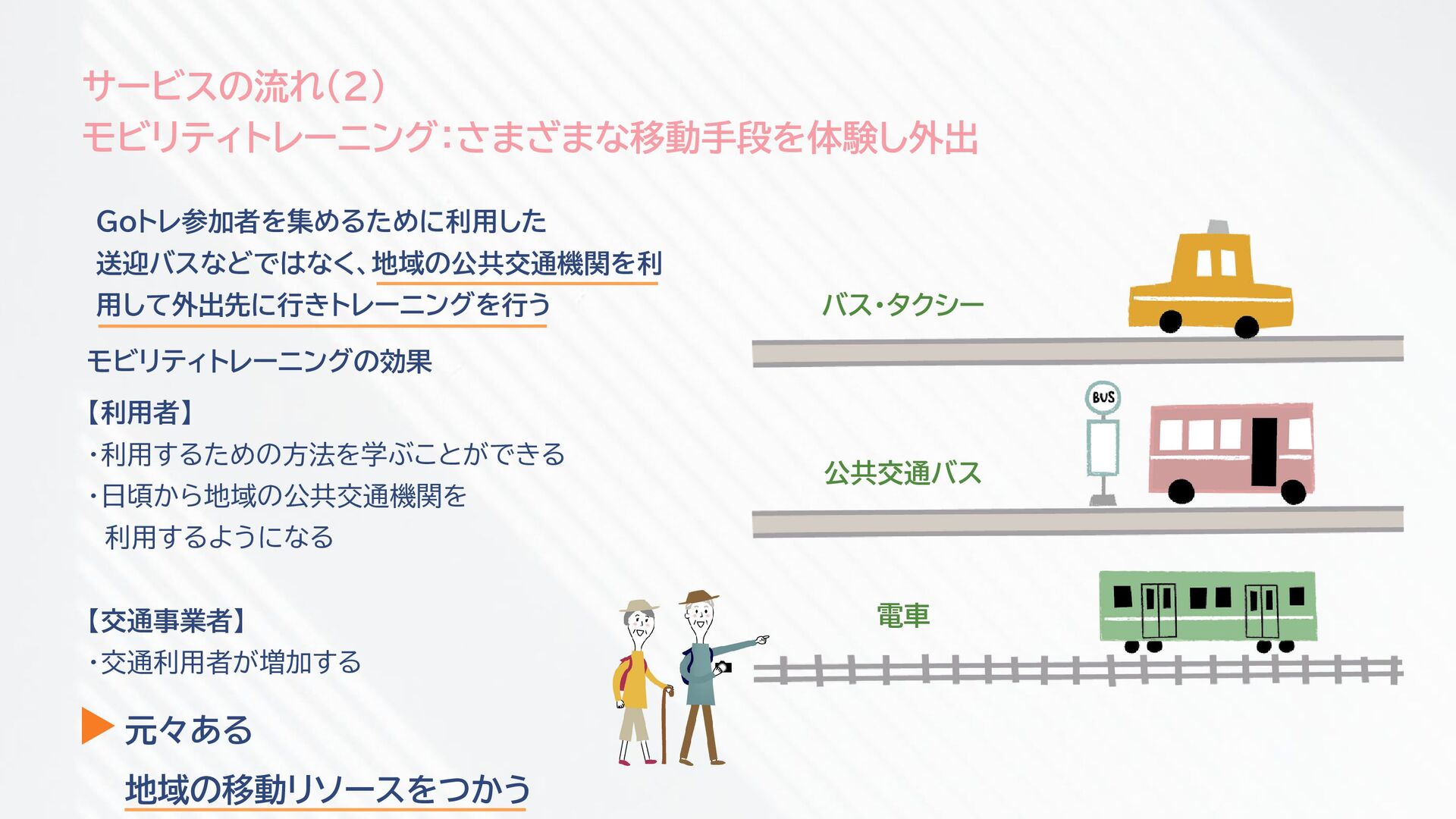 交通機関を利用する人が増えるはずが 乗り方がわからないなどで利用者が 増加していない傾向にある 地域の公共交通機関を基軸とした トレーニングのため、 公共交通機関利用者が増加し売り上げ などの増加によるインフラ維持にも 貢献する