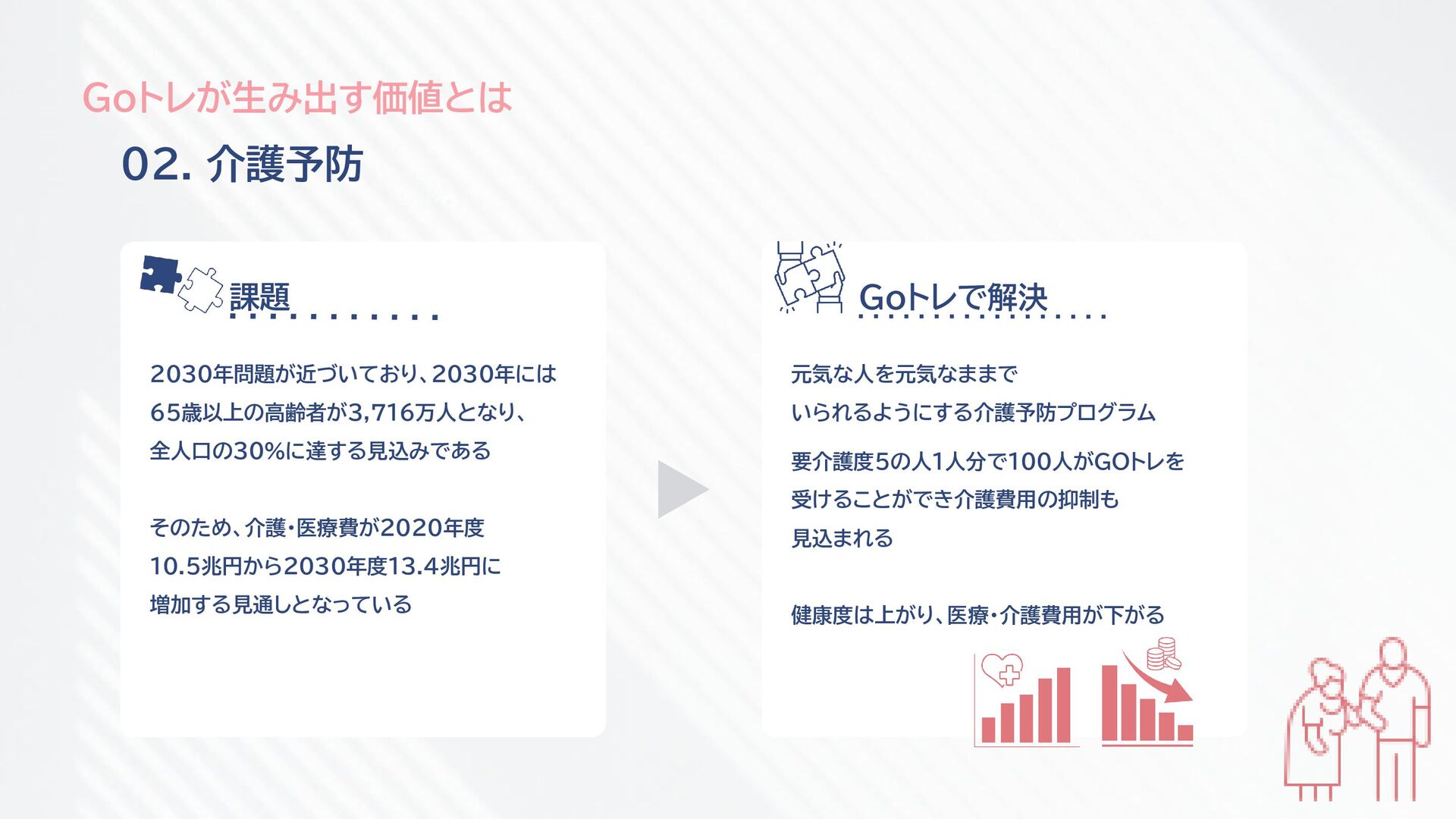Goトレで解決 課題 2030年問題が近づいており、2030年には 65歳以上の高齢者が3,716万人となり、 全人口の30%に達する見込みである そのため、介護・医療費が2020年度 10.5兆円から2030年度13.4兆円に 増加する見通しとなっている 02. 介護予防