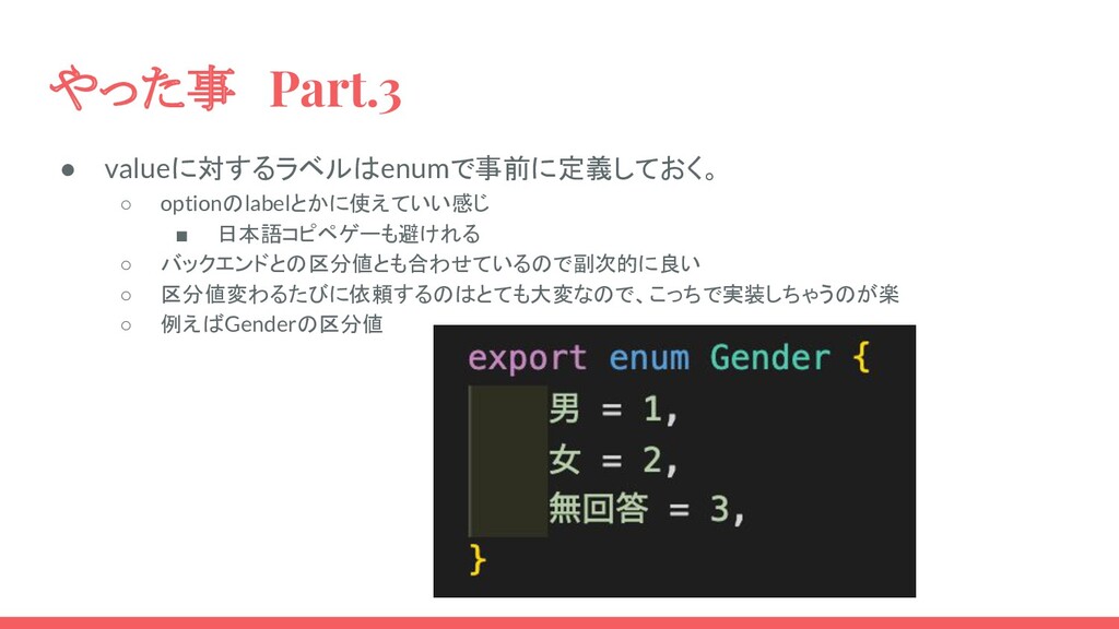 やった事 Part.3 • valueに対するラベルはenumで事前に定義しておく。 ◦ optionのlabelとかに使えていい感じ ▪ 日本語コピペゲーも避けれる ◦ バックエンドとの区分値とも合わせているので副次的に良い ◦