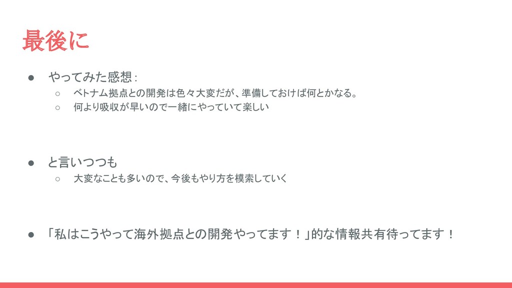最後に • やってみた感想: ◦ ベトナム拠点との開発は色々大変だが、準備しておけば何とかなる。 ◦ 何より吸収が早いので一緒にやっていて楽しい • と言いつつも ◦