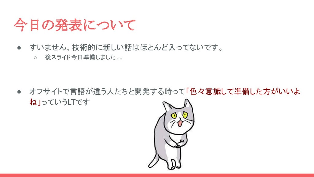 今日の発表について • すいません、技術的に新しい話はほとんど入ってないです。 ◦ 後スライド今日準備しました .... • オフサイトで言語が違う人たちと開発する時って「色々意識して準備した方がいいよ ね」っていうLTです