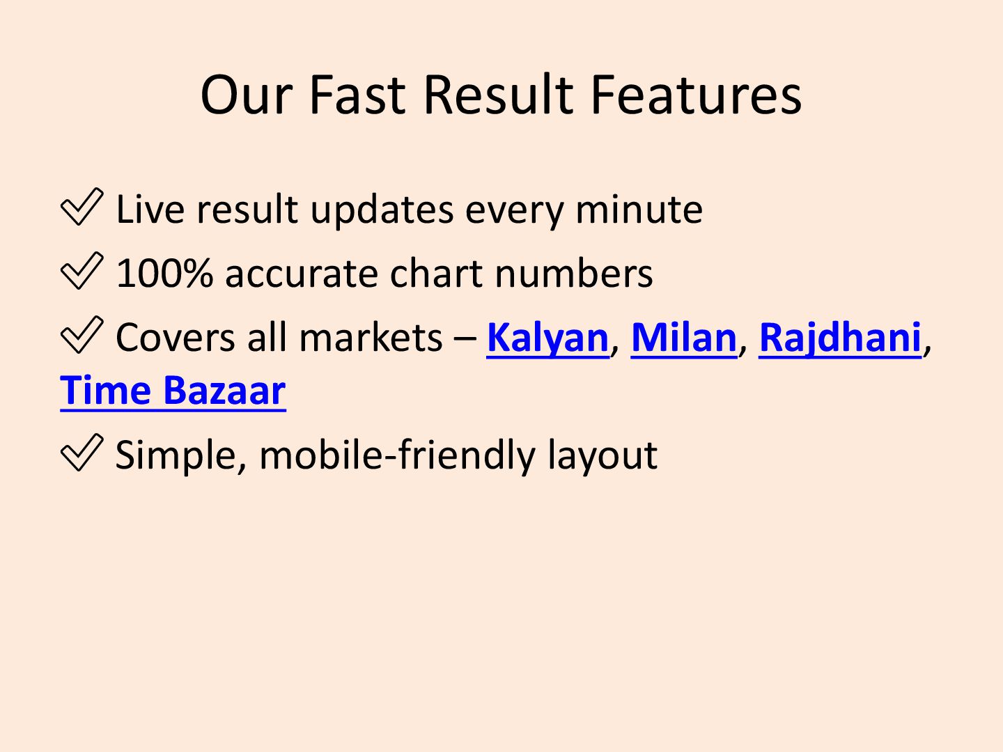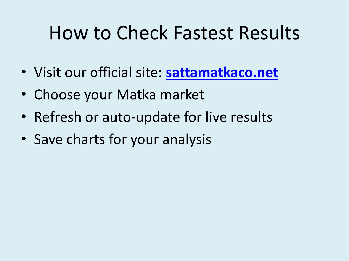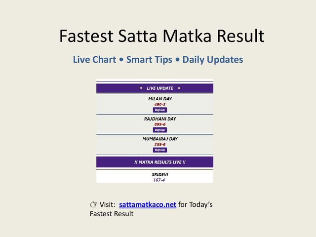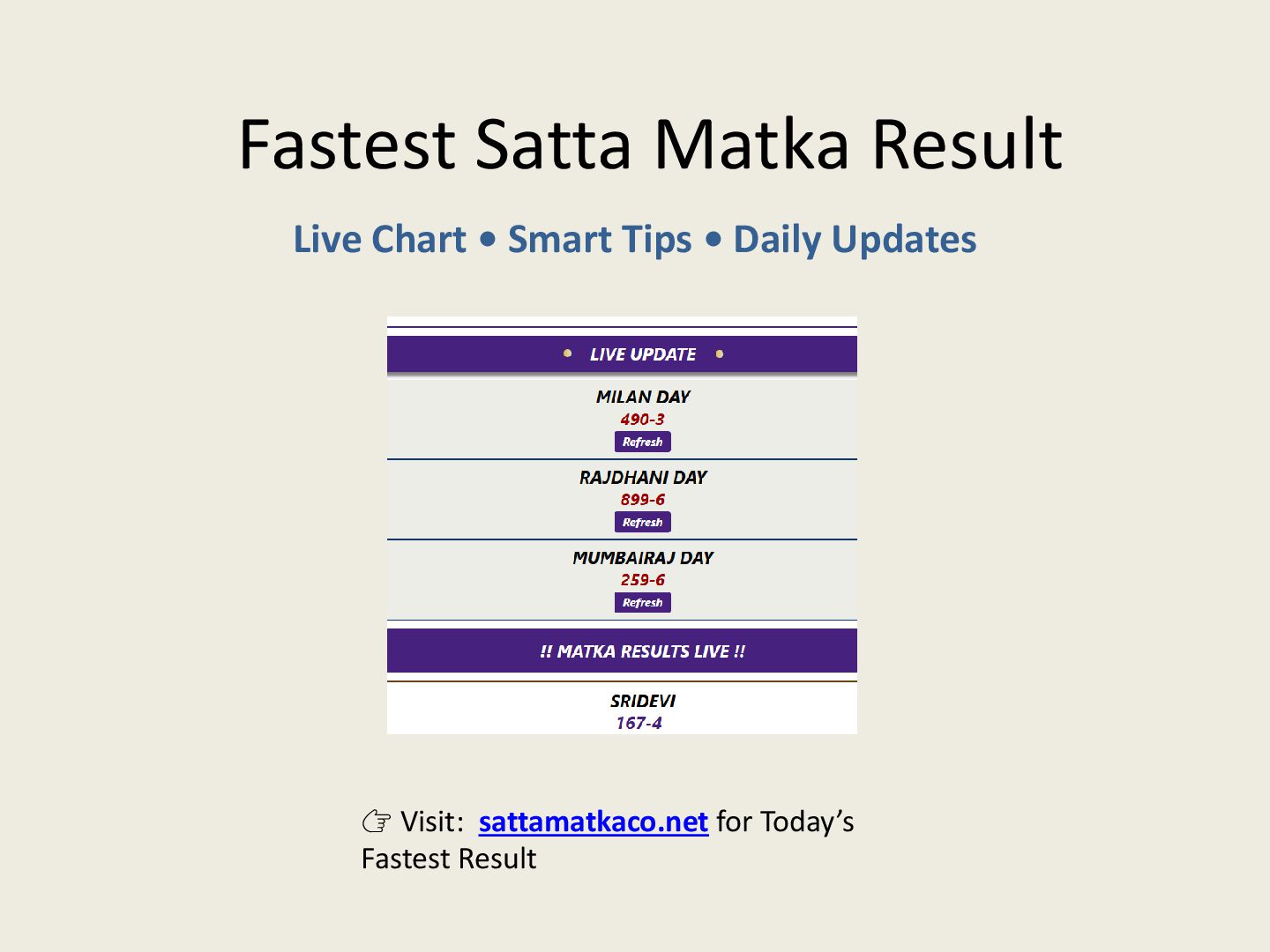 Check today’s fastest Satta Matka result live and get instant chart updates for all major markets. Our website ensures quick results, accurate numbers, and daily updates for Kalyan, Milan, Rajdhani, and more. Trusted by thousands of Matka players for real-time results. Visit https://www.sattamatkaco.net