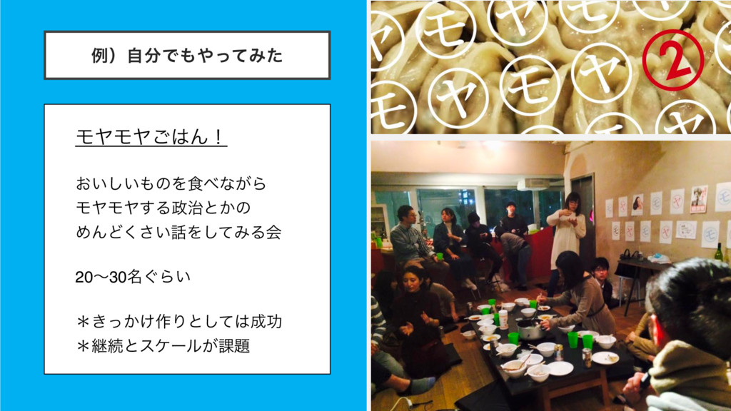 ྫʣࣗͰͬͯΈͨ ϞϠϞϠ͝Μʂ ͓͍͍͠ͷΛ৯ͳ͕Β ϞϠϞϠ͢Δ࣏ͱ͔ͷ ΊΜͲ͍͘͞Λͯ͠ΈΔձ 20ʙ30໊͙Β͍ ˎ͖͔͚ͬ࡞Γͱͯ͠ޭ ˎܧଓͱεέʔϧ͕՝