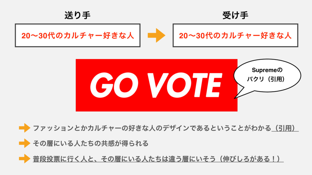 ϑΝογϣϯͱ͔Χϧνϟʔͷ͖ͳਓͷσβΠϯͰ͋Δͱ͍͏͜ͱ͕Θ͔ΔʢҾ༻ʣ ͦͷʹ͍Δਓͨͪͷڞײ͕ಘΒΕΔ ීஈථʹߦ͘ਓͱɺͦͷʹ͍Δਓͨͪҧ͏ʹ͍ͦ͏ʢ৳ͼ͠Ζ͕͋Δʂʣ 20ʙ30ͷΧϧνϟʔ͖ͳਓ 20ʙ30ͷΧϧνϟʔ͖ͳਓ ૹΓख ड͚ख Supremeͷ ύΫϦʢҾ༻ʣ