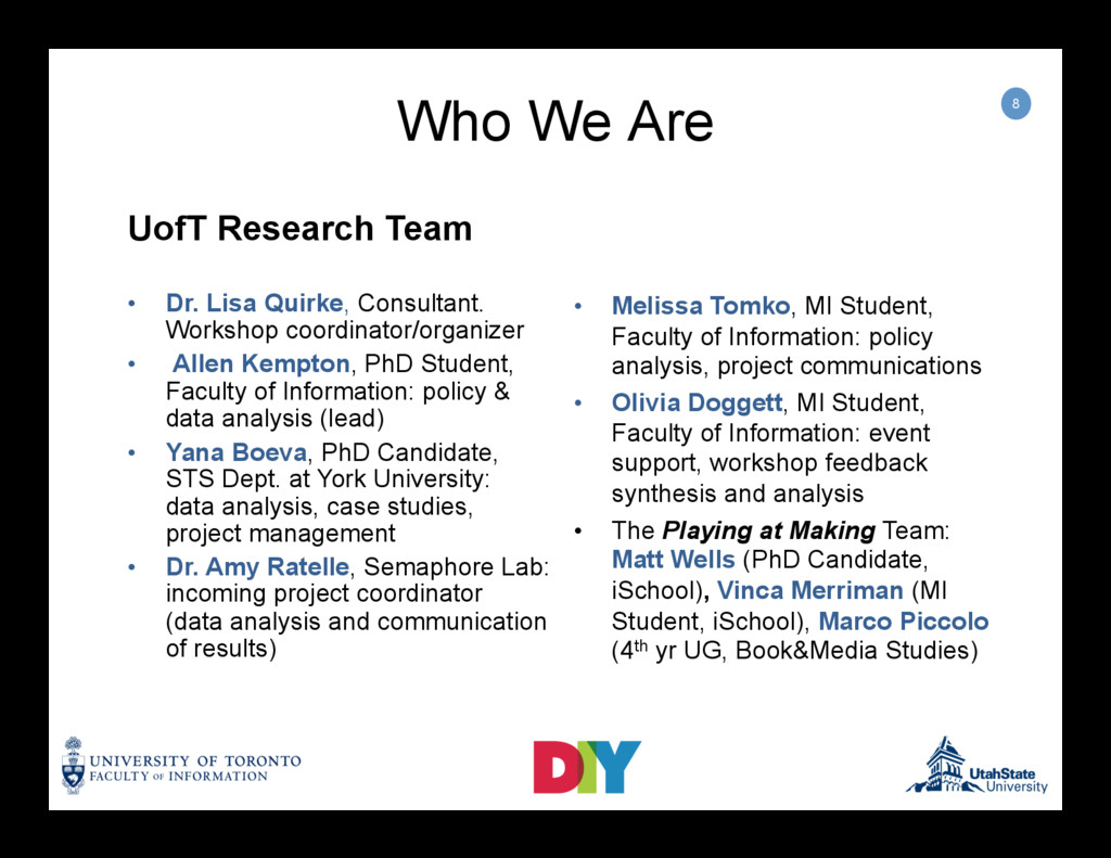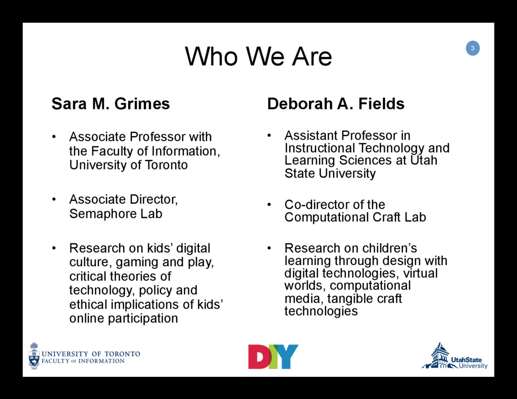 Session 1 was presented by: Dr. Sara Grimes (Principal Investigator, University of Toronto), Dr. Deborah Fields (Co-PI, Utah State University), and Yana Boeva (PhD Candidate, Research Assistant, York University). Allen Kempton (PhD Student, Research Assistant, University of Toronto), and Matt Wells (PhD Candidate, Research Assistant, University of Toronto).