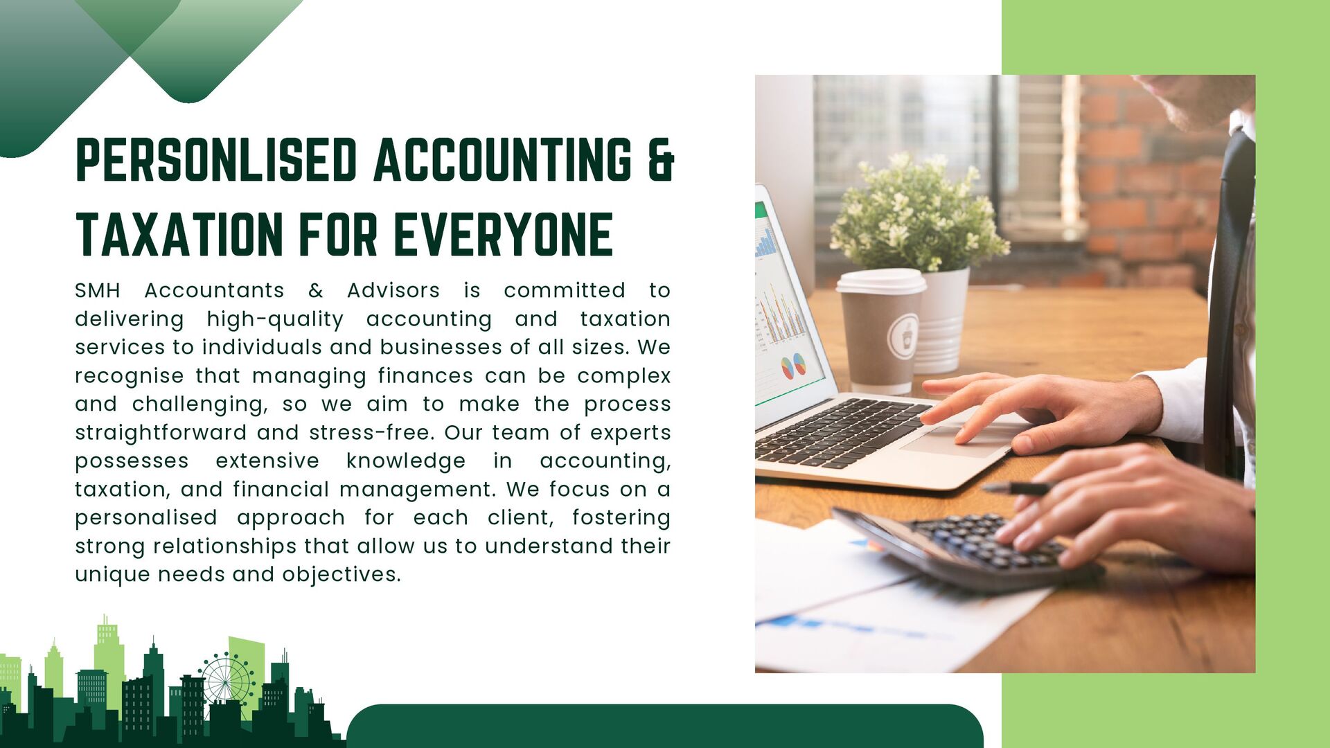 is committed to delivering high-quality accounting and taxation services to individuals and businesses of all sizes. We recognise that managing finances can be complex and challenging, so we aim to make the process straightforward and stress-free. Our team of experts possesses extensive knowledge in accounting, taxation, and financial management. We focus on a personalised approach for each client, fostering strong relationships that allow us to understand their unique needs and objectives.