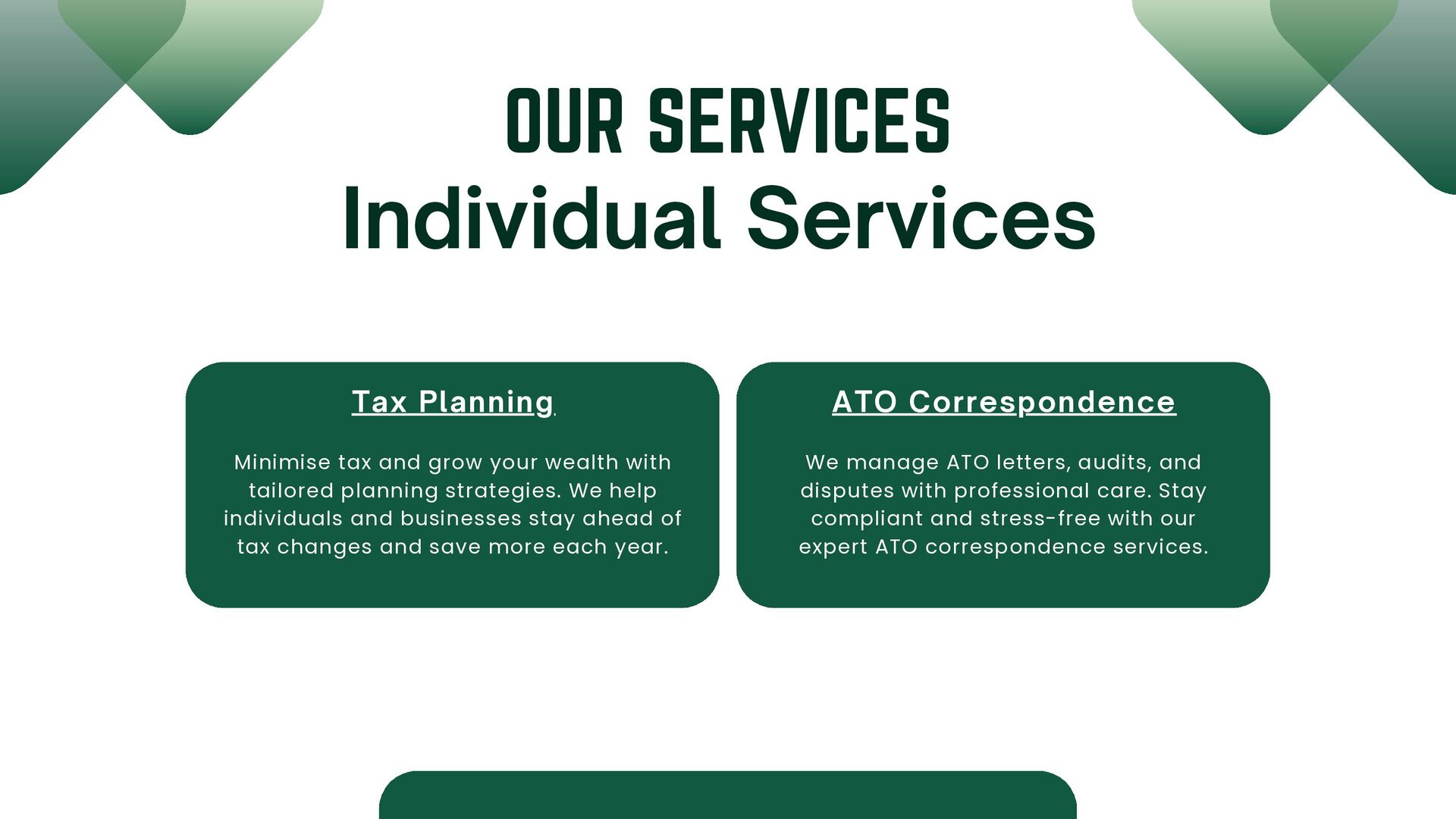 audits, and disputes with professional care. Stay compliant and stress-free with our expert ATO correspondence services. Minimise tax and grow your wealth with tailored planning strategies. We help individuals and businesses stay ahead of tax changes and save more each year. Individual Services