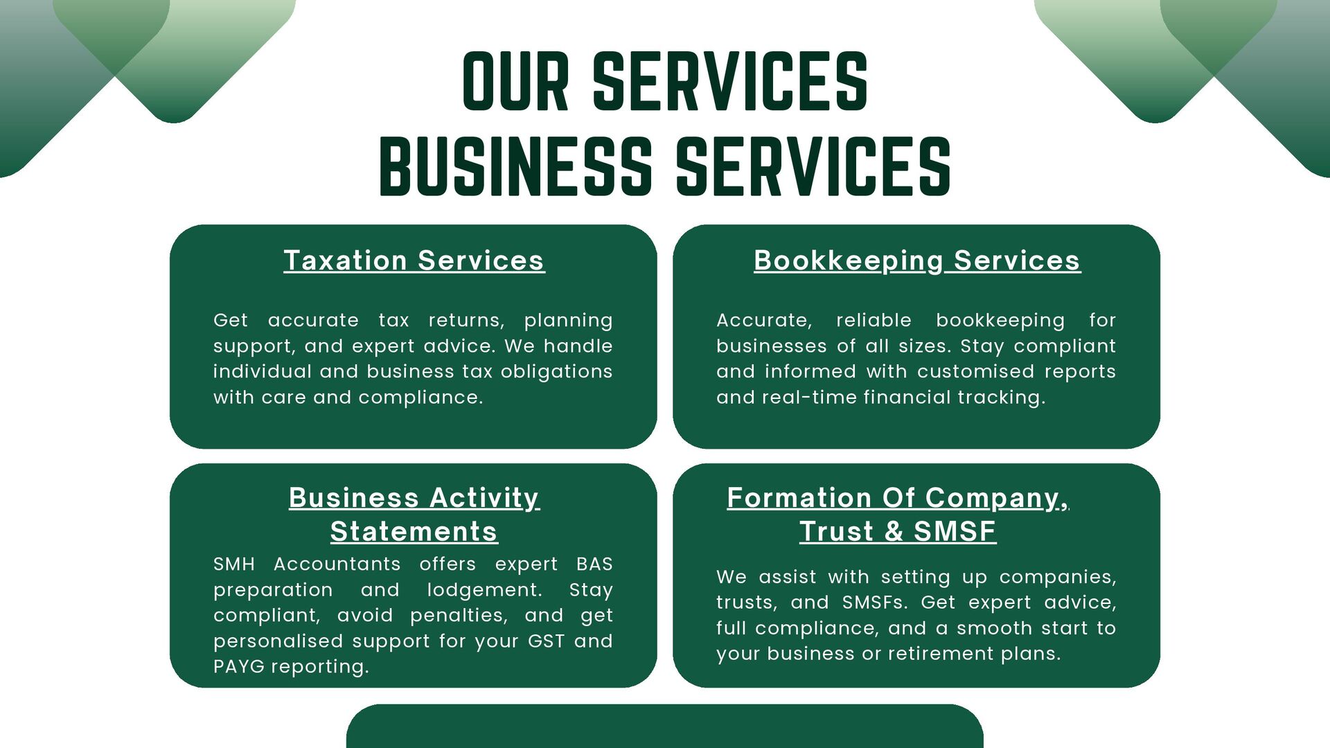 Of Company, Trust & SMSF SMH Accountants offers expert BAS preparation and lodgement. Stay compliant, avoid penalties, and get personalised support for your GST and PAYG reporting. We assist with setting up companies, trusts, and SMSFs. Get expert advice, full compliance, and a smooth start to your business or retirement plans. Accurate, reliable bookkeeping for businesses of all sizes. Stay compliant and informed with customised reports and real-time financial tracking. Get accurate tax returns, planning support, and expert advice. We handle individual and business tax obligations with care and compliance. BUSINESS SERVICES