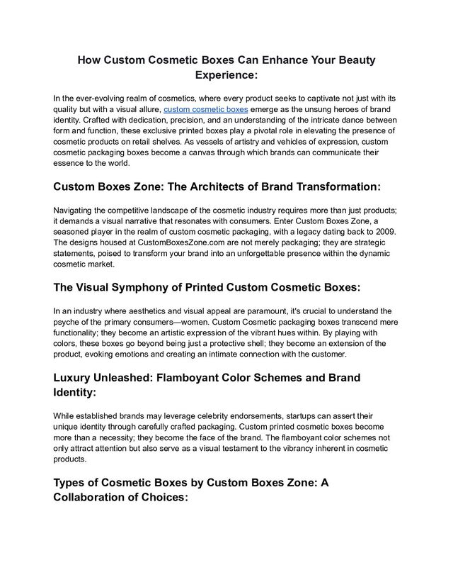 quality and reliability. Create beautifully designed cosmetic custom boxes that align with the theme of your brand, offering a unique, memorable experience for your customers. Striking Color Schemes: An Irresistible Magnet for Customers: Custom boxes for cosmetics with striking color schemes not only attract customers but also serve as cost-effective marketing tools for your products and brand. The uniqueness of the box, imprinted with your logo, helps consumers remember and identify their favorite brand. As they use your product, people in their vicinity also notice the brand, enhancing visibility and brand recognition. Investing in custom boxes Zone becomes a cost-effective strategy, where the benefits in terms of brand visibility and consumer appeal far outweigh the associated costs. Customized Cosmetic Boxes with Logo: A Powerful Marketing Tool: Placing your brand logo prominently on the face of custom cosmetic boxes ensures free promotion every time a customer glances at the product. If you find yourself grappling with advertising strategy decisions or budget constraints, having a product logo on the cosmetic packaging box, along with other crucial details, can provide a competitive advantage. This simple yet effective strategy turns every product into a brand ambassador, subtly promoting your business with each purchase. As consumers associate the logo with a positive experience, brand loyalty and recognition naturally follow, contributing to long-term success in a highly competitive market. Furthermore, in an industry where competition is fierce, and packaging trends evolve rapidly, Custom Boxes Zone emerges as a reliable partner. Offering a diverse range of customization options, including matte, glossy, lamination, foil stamping, and more, they ensure that your custom cosmetic box packaging stands out gloriously. The addition of your brand's logo on wholesale cosmetic packages, available at competitive rates, further solidifies your brand's presence in the market. Custom Boxes Zone doesn't just supply packaging; they offer a strategic approach to elevate your cosmetic brand, helping you navigate the ever-changing landscape with innovative solutions that reflect the dynamism of the cosmetic industry. In conclusion, the journey to success in the cosmetic industry involves more than just creating quality products. It requires a meticulous attention to packaging design that aligns with the brand's identity, captures the consumer's attention, and establishes a lasting connection. Custom cosmetic boxes from Custom Boxes Zone not only meet these criteria but also go above and beyond, providing a canvas for brands to express their uniqueness and build a visual symphony that resonates with consumers. Elevate your brand with packaging that is not merely functional but a work of art that tells a story, captivates the audience, and propels your cosmetic business to new heights.