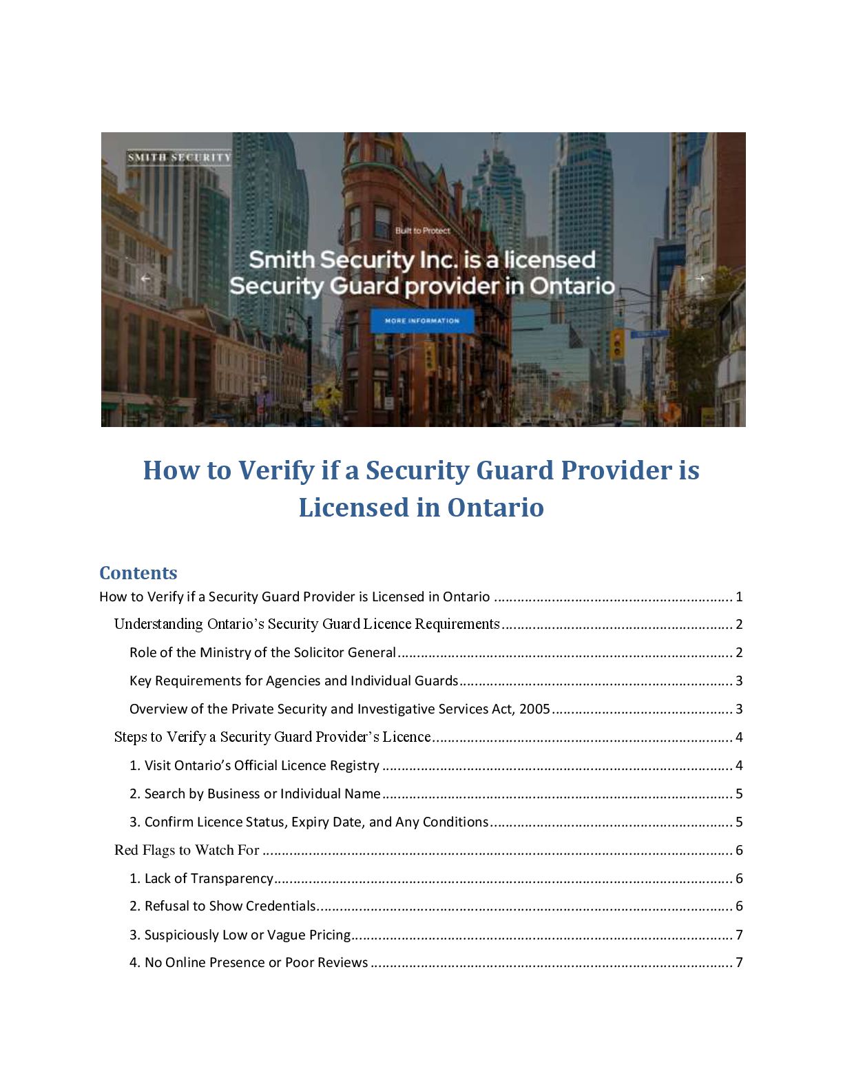 Learn how to verify if a security guard or agency is licensed in Ontario. Follow simple steps to check licence status and avoid red flags. Ensure compliance with provincial laws. For more, visit: https://smithsecurity.ca
