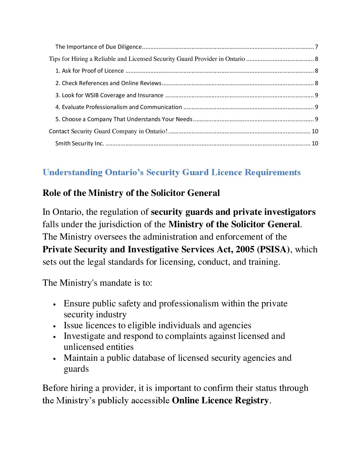 a Reliable and Licensed Security Guard Provider in Ontario ......................................... 8 1. Ask for Proof of Licence .................................................................................................................. 8 2. Check References and Online Reviews ............................................................................................ 8 3. Look for WSIB Coverage and Insurance .......................................................................................... 9 4. Evaluate Professionalism and Communication ............................................................................... 9 5. Choose a Company That Understands Your Needs ......................................................................... 9 Contact Security Guard Company in Ontario! ...................................................................................... 10 Smith Security Inc. ............................................................................................................................ 10 Understanding Ontario’s Security Guard Licence Requirements Role of the Ministry of the Solicitor General In Ontario, the regulation of security guards and private investigators falls under the jurisdiction of the Ministry of the Solicitor General. The Ministry oversees the administration and enforcement of the Private Security and Investigative Services Act, 2005 (PSISA), which sets out the legal standards for licensing, conduct, and training. The Ministry's mandate is to: Ensure public safety and professionalism within the private security industry Issue licences to eligible individuals and agencies Investigate and respond to complaints against licensed and unlicensed entities Maintain a public database of licensed security agencies and guards Before hiring a provider, it is important to confirm their status through the Ministry’s publicly accessible Online Licence Registry.