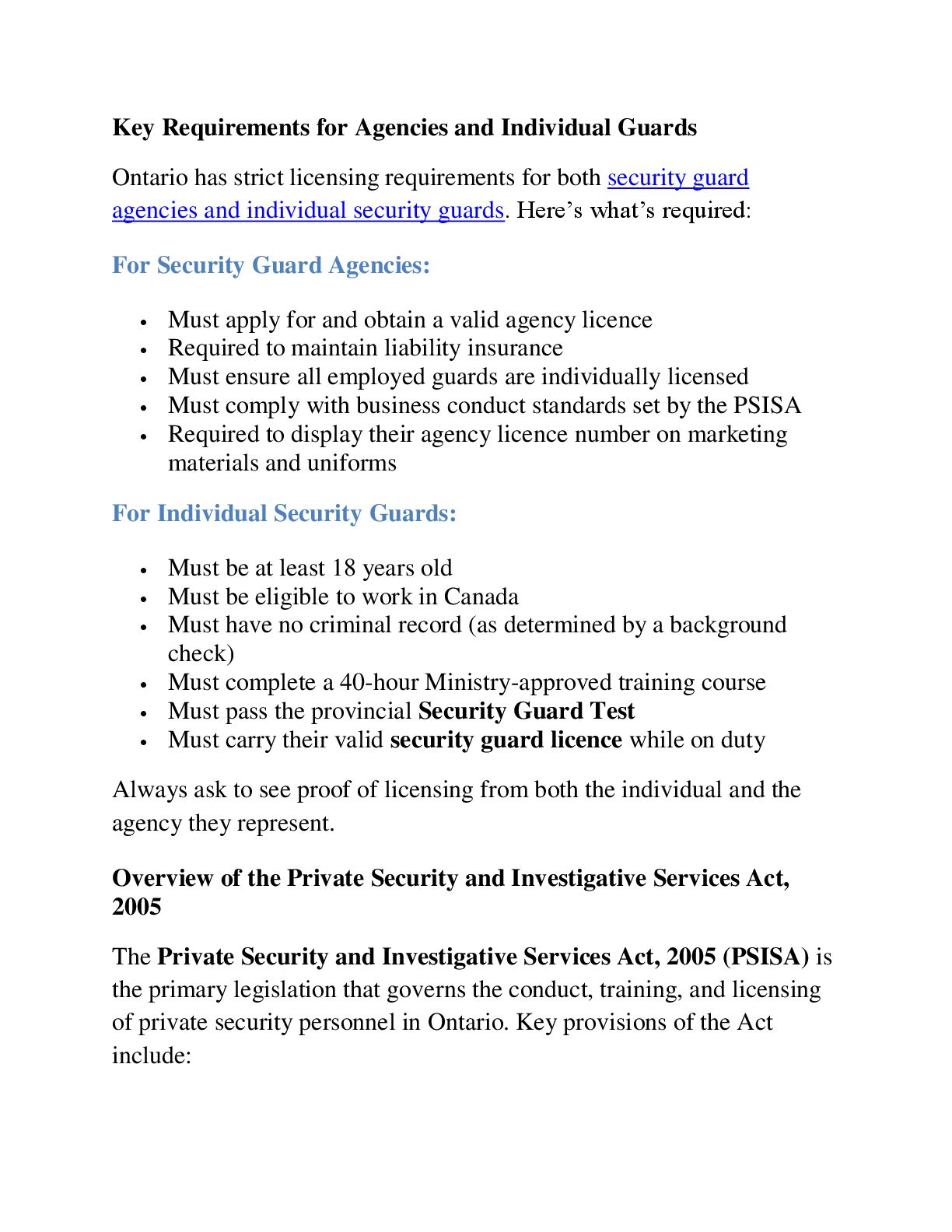 licensing requirements for both security guard agencies and individual security guards. Here’s what’s required: For Security Guard Agencies: Must apply for and obtain a valid agency licence Required to maintain liability insurance Must ensure all employed guards are individually licensed Must comply with business conduct standards set by the PSISA Required to display their agency licence number on marketing materials and uniforms For Individual Security Guards: Must be at least 18 years old Must be eligible to work in Canada Must have no criminal record (as determined by a background check) Must complete a 40-hour Ministry-approved training course Must pass the provincial Security Guard Test Must carry their valid security guard licence while on duty Always ask to see proof of licensing from both the individual and the agency they represent. Overview of the Private Security and Investigative Services Act, 2005 The Private Security and Investigative Services Act, 2005 (PSISA) is the primary legislation that governs the conduct, training, and licensing of private security personnel in Ontario. Key provisions of the Act include: