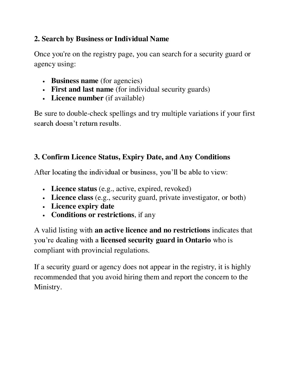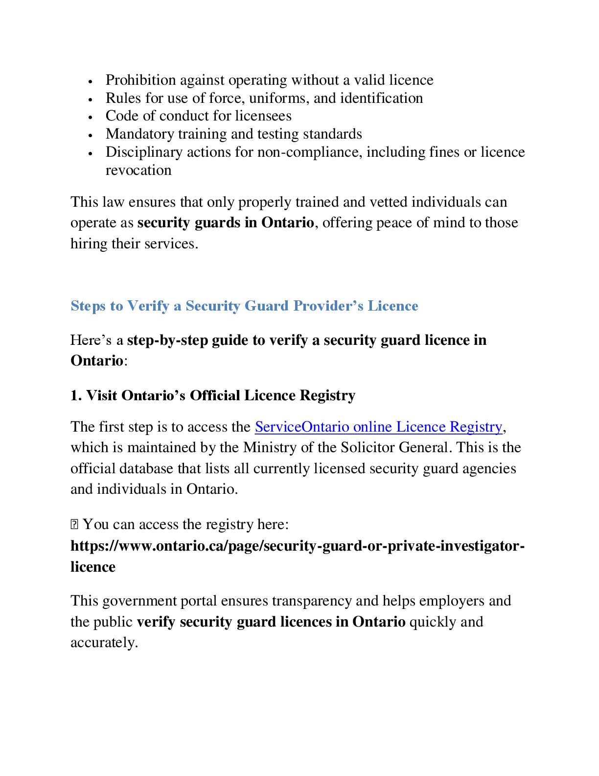 for use of force, uniforms, and identification Code of conduct for licensees Mandatory training and testing standards Disciplinary actions for non-compliance, including fines or licence revocation This law ensures that only properly trained and vetted individuals can operate as security guards in Ontario, offering peace of mind to those hiring their services. Steps to Verify a Security Guard Provider’s Licence Here’s a step-by-step guide to verify a security guard licence in Ontario: 1. Visit Ontario’s Official Licence Registry The first step is to access the ServiceOntario online Licence Registry, which is maintained by the Ministry of the Solicitor General. This is the official database that lists all currently licensed security guard agencies and individuals in Ontario. You can access the registry here: https://www.ontario.ca/page/security-guard-or-private-investigator- licence This government portal ensures transparency and helps employers and the public verify security guard licences in Ontario quickly and accurately.