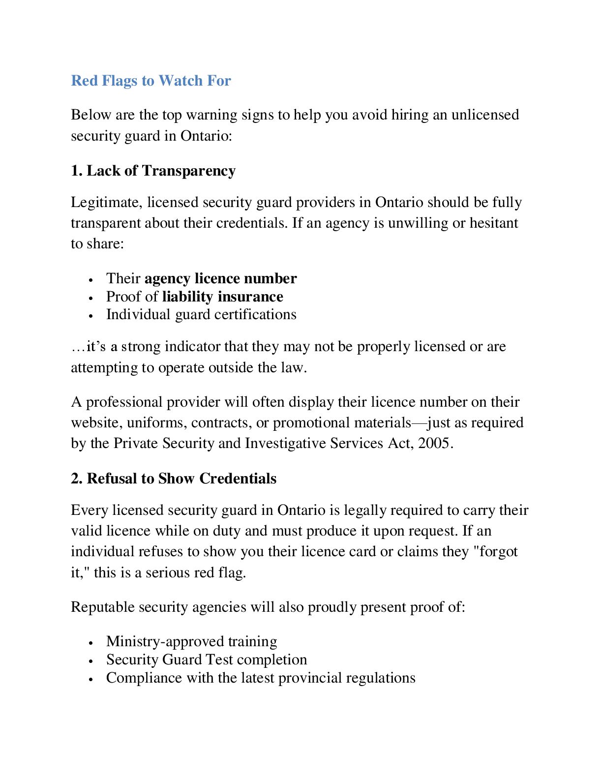 signs to help you avoid hiring an unlicensed security guard in Ontario: 1. Lack of Transparency Legitimate, licensed security guard providers in Ontario should be fully transparent about their credentials. If an agency is unwilling or hesitant to share: Their agency licence number Proof of liability insurance Individual guard certifications …it’s a strong indicator that they may not be properly licensed or are attempting to operate outside the law. A professional provider will often display their licence number on their website, uniforms, contracts, or promotional materials—just as required by the Private Security and Investigative Services Act, 2005. 2. Refusal to Show Credentials Every licensed security guard in Ontario is legally required to carry their valid licence while on duty and must produce it upon request. If an individual refuses to show you their licence card or claims they "forgot it," this is a serious red flag. Reputable security agencies will also proudly present proof of: Ministry-approved training Security Guard Test completion Compliance with the latest provincial regulations