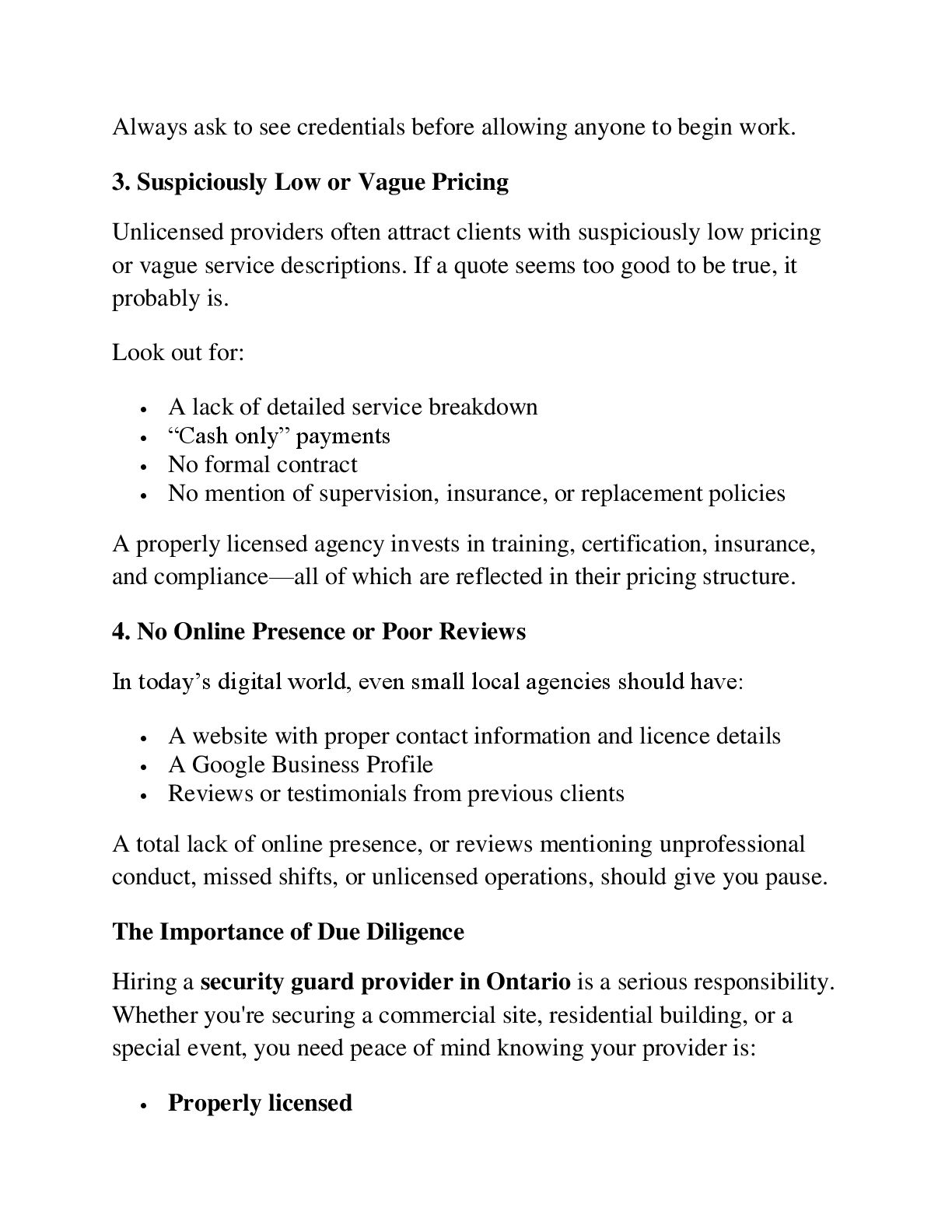 work. 3. Suspiciously Low or Vague Pricing Unlicensed providers often attract clients with suspiciously low pricing or vague service descriptions. If a quote seems too good to be true, it probably is. Look out for: A lack of detailed service breakdown “Cash only” payments No formal contract No mention of supervision, insurance, or replacement policies A properly licensed agency invests in training, certification, insurance, and compliance—all of which are reflected in their pricing structure. 4. No Online Presence or Poor Reviews In today’s digital world, even small local agencies should have: A website with proper contact information and licence details A Google Business Profile Reviews or testimonials from previous clients A total lack of online presence, or reviews mentioning unprofessional conduct, missed shifts, or unlicensed operations, should give you pause. The Importance of Due Diligence Hiring a security guard provider in Ontario is a serious responsibility. Whether you're securing a commercial site, residential building, or a special event, you need peace of mind knowing your provider is: Properly licensed
