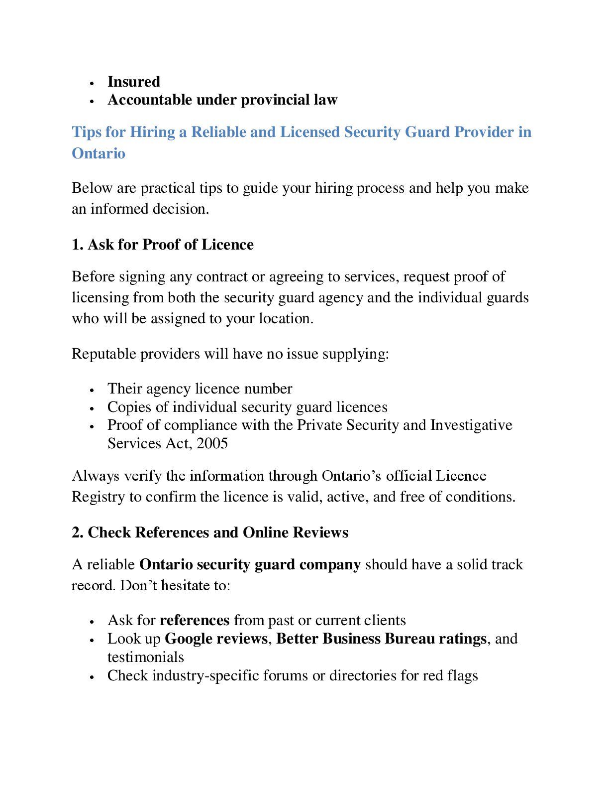 a Reliable and Licensed Security Guard Provider in Ontario Below are practical tips to guide your hiring process and help you make an informed decision. 1. Ask for Proof of Licence Before signing any contract or agreeing to services, request proof of licensing from both the security guard agency and the individual guards who will be assigned to your location. Reputable providers will have no issue supplying: Their agency licence number Copies of individual security guard licences Proof of compliance with the Private Security and Investigative Services Act, 2005 Always verify the information through Ontario’s official Licence Registry to confirm the licence is valid, active, and free of conditions. 2. Check References and Online Reviews A reliable Ontario security guard company should have a solid track record. Don’t hesitate to: Ask for references from past or current clients Look up Google reviews, Better Business Bureau ratings, and testimonials Check industry-specific forums or directories for red flags