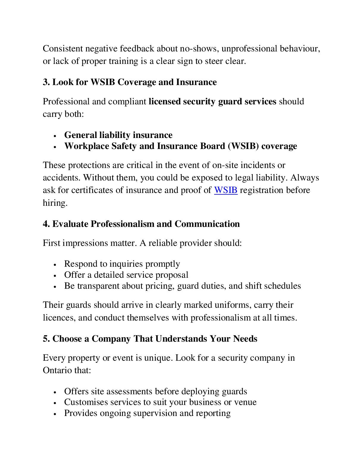 proper training is a clear sign to steer clear. 3. Look for WSIB Coverage and Insurance Professional and compliant licensed security guard services should carry both: General liability insurance Workplace Safety and Insurance Board (WSIB) coverage These protections are critical in the event of on-site incidents or accidents. Without them, you could be exposed to legal liability. Always ask for certificates of insurance and proof of WSIB registration before hiring. 4. Evaluate Professionalism and Communication First impressions matter. A reliable provider should: Respond to inquiries promptly Offer a detailed service proposal Be transparent about pricing, guard duties, and shift schedules Their guards should arrive in clearly marked uniforms, carry their licences, and conduct themselves with professionalism at all times. 5. Choose a Company That Understands Your Needs Every property or event is unique. Look for a security company in Ontario that: Offers site assessments before deploying guards Customises services to suit your business or venue Provides ongoing supervision and reporting
