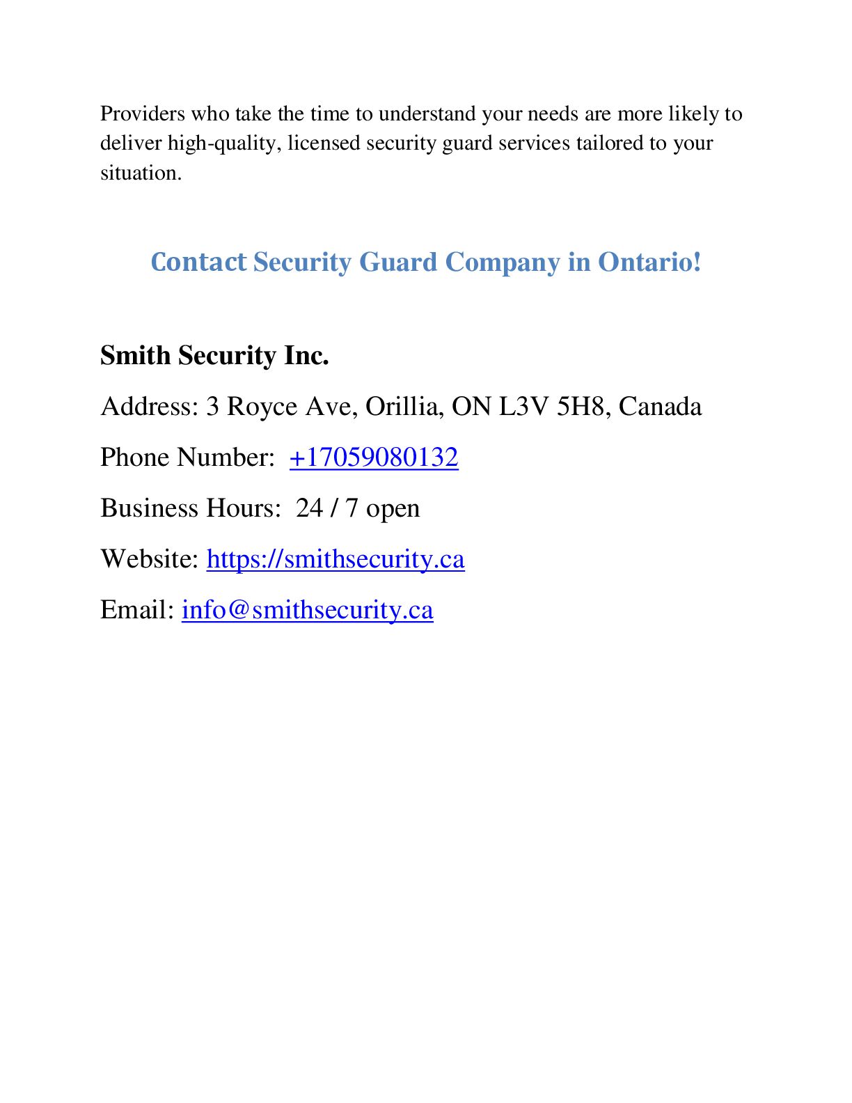 more likely to deliver high-quality, licensed security guard services tailored to your situation. Contact Security Guard Company in Ontario! Smith Security Inc. Address: 3 Royce Ave, Orillia, ON L3V 5H8, Canada Phone Number: +17059080132 Business Hours: 24 / 7 open Website: https://smithsecurity.ca Email: [email protected]