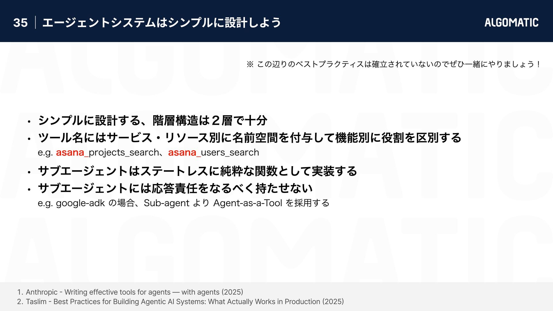 google-adk の場合、Sub-agent より Agent-as-a-Tool を採用する asana_ asana_ ※ この辺りのベストプラクティスは確立されていないのでぜひ一緒にやりましょう! Anthropic - Writing effective tools for agents — with agents (2025) Taslim - Best Practices for Building Agentic AI Systems: What Actually Works in Production (2025)