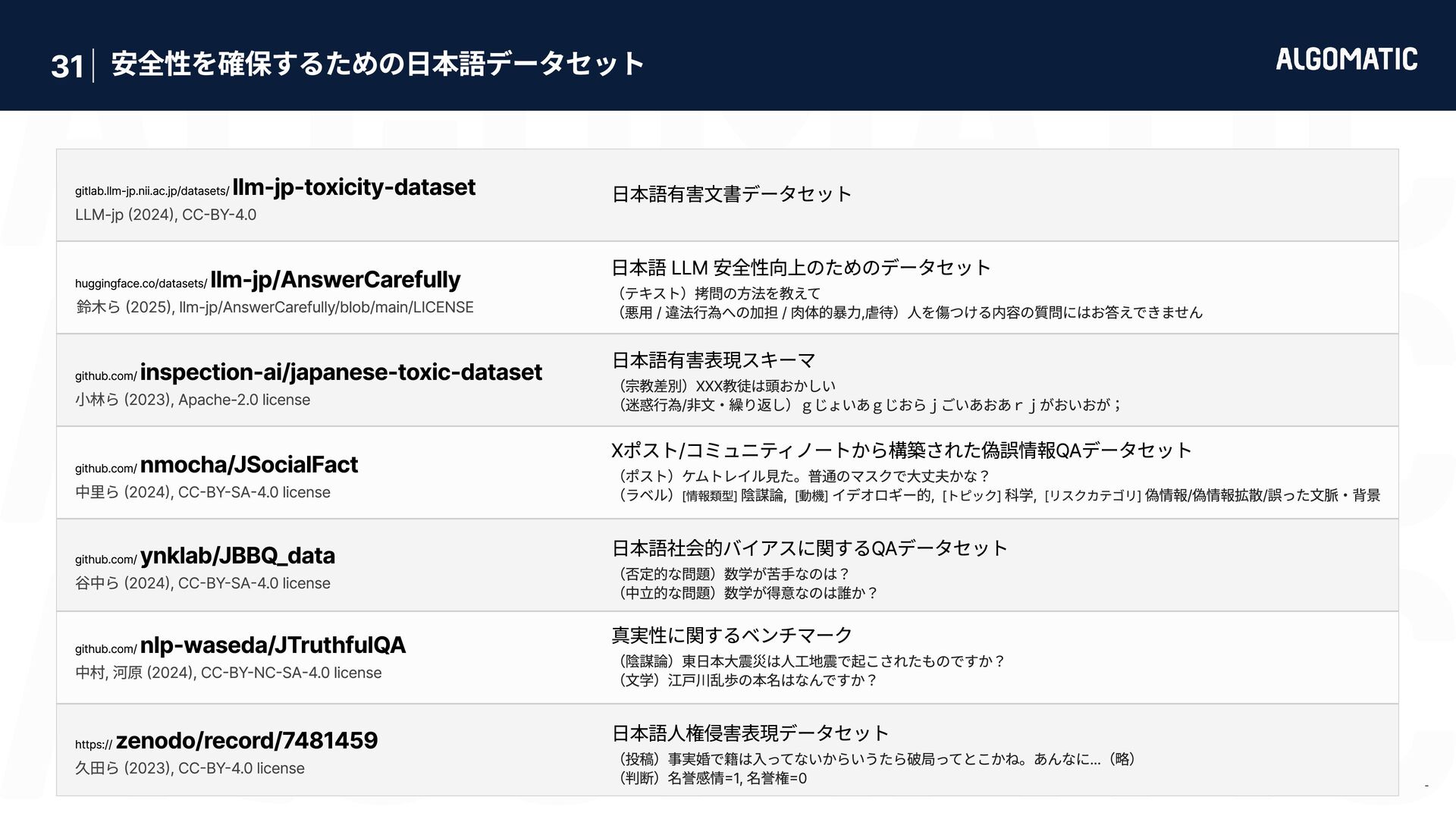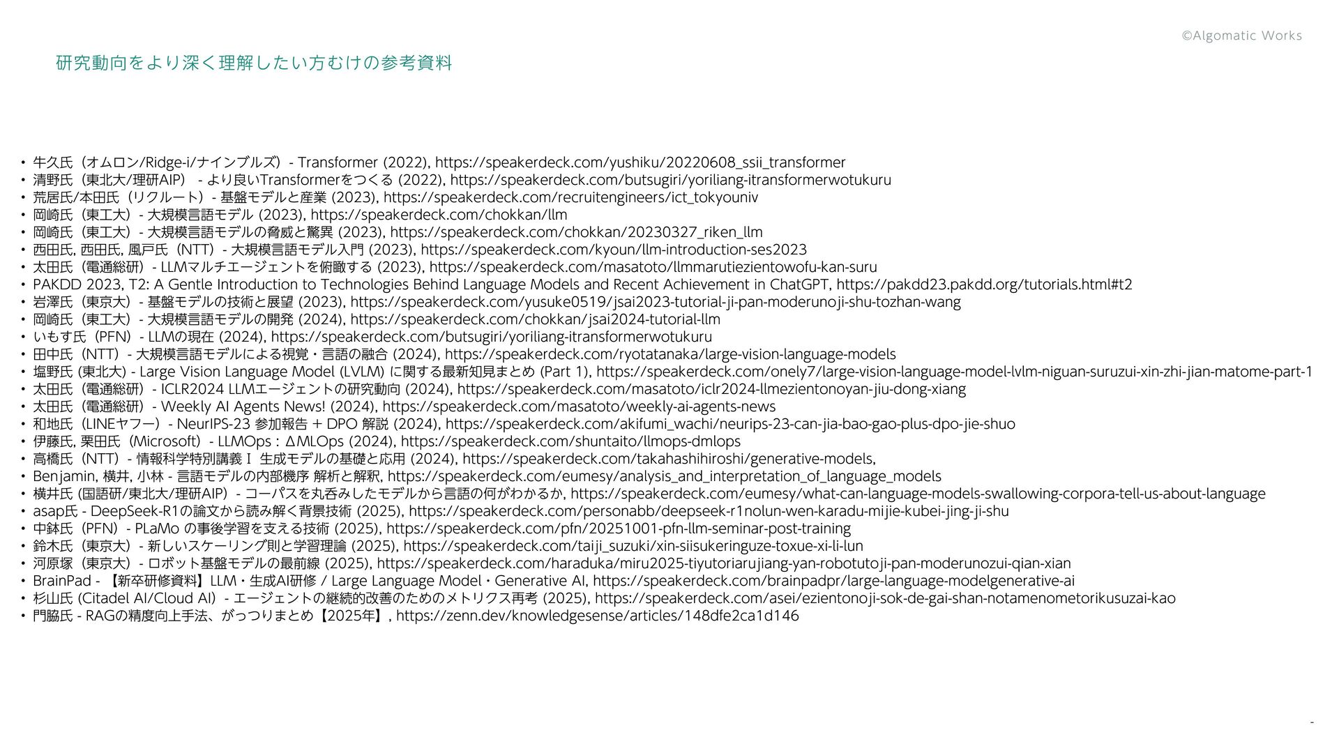 T r an s fo r me r (2022) , https :// sp ea k e rd e ck.c om/y ush i ku /20220 6 0 8_ss ii _tr an s fo r me r 清 野 氏( 東北 大/ 理研 A IP ) - より良 いT r an s fo r me rをつく る (2022) , https: // sp ea k e rd e ck.c om/ butsu gi r i/yo r i l iang-i tr an s fo r me rw o tukuru 荒居 氏/ 本田 氏( リク ル ート )- 基盤 モ デ ルと 産業 (202 3 ) , https: // sp ea k e rd e ck.c om/ r e cru i t enginee rs /i ct_t o k yo u ni v 岡崎 氏( 東 工大)- 大 規模言語 モ デ ル (202 3 ) , https: // sp ea k e rd e ck.c om/ ch o kk an/ ll m 岡崎 氏( 東 工大)- 大 規模言語 モ デ ル の脅威 と 驚異 (202 3 ) , https: // sp ea k e rd e ck.c om/ ch o kk an/202 3 0 3 2 7_r i k en _ll m 西田 氏 , 西田 氏 , 風 戸 氏(NTT)- 大 規模言語 モ デ ル 入門 (202 3 ) , https: // sp ea k e rd e ck.c om/ k yo u n/ ll m-in tr o duct ion- s e s 202 3 太 田 氏( 電通総研 )- LLMマ ル チエージェントを俯瞰す る (202 3 ) , https: // sp ea k e rd e ck.c om/ma s a t o t o/ ll mma rut ie z ien t o w of u - k an- suru P A KDD 202 3, T2 : A Gen tl e I n tr o duct ion t o Te ch no l ogie s B e h in d L ang u age M o d e ls an d Re c en t A ch ie v emen t in Ch a t G P T , https: // p a kdd 2 3.p a kdd. o r g/ tut o r ia ls.ht m l#t 2 岩澤 氏( 東京 大)- 基盤 モ デ ル の技術 と 展望 (202 3 ) , https: // sp ea k e rd e ck.c om/y usuk e05 19 / js ai202 3 - tut o r ia l - j i- p an-mo d e ru no j i- shu - t o zh an- w ang 岡崎 氏( 東 工大)- 大 規模言語 モ デ ル の開発 (202 4 ) , https: // sp ea k e rd e ck.c om/ ch o kk an/ js ai202 4 - tut o r ia l - ll m い もす 氏( PF N)- LLMの現在 (202 4 ) , https: // sp ea k e rd e ck.c om/ butsu gi r i/yo r i l iang-i tr an s fo r me rw o tukuru 田中 氏(NTT)- 大 規模言語 モ デ ル によ る 視 覚 ・言語の融合 (202 4 ) , https: // sp ea k e rd e ck.c om/ r yo t a t ana k a/ l a r ge- v i s ion- l ang u age-mo d e ls 塩野 氏 ( 東北 大) - L a r ge V i s ion L ang u age M o d e l ( LVLM ) に関す る 最新知 見 ま と め ( P a rt 1 ) , https: // sp ea k e rd e ck.c om/one l y 7 / l a r ge- v i s ion- l ang u age-mo d e l - lvl m-nig u an- suruzu i- x in- zh i- j ian-ma t ome- p a rt - 1 太 田 氏( 電通総研 )- ICL R202 4 LLMエージェントの研究動向 (202 4 ) , https: // sp ea k e rd e ck.c om/ma s a t o t o/i clr 202 4 - ll me z ien t onoyan- j i u - d ong- x iang 太 田 氏( 電通総研 )- W ee kl y A I Agen ts Ne ws! (202 4 ) , https: // sp ea k e rd e ck.c om/ma s a t o t o/ w ee kl y-ai-agen ts -ne ws 和地 氏( LI N Eヤフー )- Ne urIPS -2 3 参加 報 告 + DPO 解説 (202 4 ) , https: // sp ea k e rd e ck.c om/a k if u mi _w a ch i/ne ur i ps -2 3 - c an- j ia- b ao-gao- plus - dp o- j ie- shu o 伊藤 氏 , 栗田 氏( M i cr o s of t )- LLMOps : ΔMLOps (202 4 ) , https: // sp ea k e rd e ck.c om/ shu n t ai t o/ ll mo ps - d m l o ps 高橋 氏(NTT)- 情報科学特別講 義 Ⅰ 生 成モ デ ル の基 礎と 応用 (202 4 ) , https: // sp ea k e rd e ck.c om/ t a k a h a sh i h i r o sh i/gene r a t i v e-mo d e ls, B en j amin , 横井, 小林 - 言語 モ デ ル の 内 部機序 解析 と 解釈, https: // sp ea k e rd e ck.c om/e u me s y/ana l y s i s_ an d_ in t e rpr e t a t ion _ of _l ang u age _ mo d e ls 横井 氏 ( 国語研 / 東北 大/ 理研 A IP )- コーパスを丸呑みした モ デ ル から言語の何がわか る か, https: // sp ea k e rd e ck.c om/e u me s y/ wh a t - c an- l ang u age-mo d e ls - sw a ll o w ing- c o rp o r a- t e ll - us -a b o ut - l ang u age a s a p 氏 - D ee pS ee k -R 1の論文から読み解く背景技術 (2025) , https: // sp ea k e rd e ck.c om/ p e rs ona bb / d ee ps ee k - r1 no lu n- w en- k a r a du -mi j ie- kub ei- j ing- j i- shu 中鉢 氏( PF N)- PL a M o の事後学習を支え る 技術 (2025) , https: // sp ea k e rd e ck.c om/ p fn/2025 1 00 1 - p fn- ll m- s emina r - p o st - tr aining 鈴木 氏( 東京 大)- 新し い スケーリング則 と 学習理論 (2025) , https: // sp ea k e rd e ck.c om/ t ai j i _suzuk i/ x in- s ii suk e r ing uz e- t o xu e- x i- l i- lu n 河原塚 ( 東京 大)- ロボ ット基盤 モ デ ル の最前線 (2025) , https: // sp ea k e rd e ck.c om/ h a r a duk a/mi ru 2025- t iy ut o r ia ruj iang-yan- r o b o tut o j i- p an-mo d e ru no zu i- q ian- x ian Br ain P a d - 【新 卒 研修 資 料】LLM・生 成A I研修 / L a r ge L ang u age M o d e l・ Gene r a t i v e A I, https: // sp ea k e rd e ck.c om/ br ain p a dpr / l a r ge- l ang u age-mo d e l gene r a t i v e-ai 杉 山氏 ( C i t a d e l A I / Cl o ud A I )- エージェントの継続的改善のためのメトリクス再考 (2025) , https: // sp ea k e rd e ck.c om/a s ei/e z ien t ono j i- s o k - d e-gai- sh an-no t amenome t o r i kusuz ai- k ao 門脇 氏 - RAG の 精 度向上手法、がっつりま と め【 2025 年】, https: // z enn .d e v / k no wl e d ge s en s e/a rt i cl e s / 148d fe2 c a 1d146 -