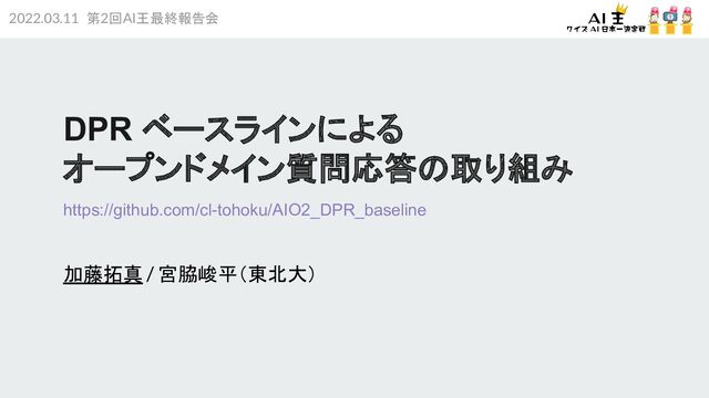 → 推論時における検索対象数との大きな差が検索性能に影響 ◦ クエリと文書間の関係のみモデル化 → 文書間同士の類似関係を考慮しない ◦ ハード負例文書を語のマッチングにより作成 → false negative 文書が負例となる可能性あり • ベクトルのメモリ効率化 : [Izacard+’20; Yamada+’21; Zhan+’21; Santhanam+’21; Ma+’21; Zhan+’22] ◦ 検索対象の文書数が膨大 → メモリコストが大きい • クエリとのマッチング強化 : [Sciavolino+’21; Liu+’21; Khattab+’21; Gao+’21; Wang+’21; Wu+’22] ◦ CLS トークンによるマッチング → トークンレベルなど粒度の高いマッチングが難しい • 汎化性能の向上: [Zhuang+’21; Ni+’21; Liu+’21; Chen+’21; Wang+’21] • データ・クエリ拡張: [Lee+’19; Guu+’20; Qu+’21; Izacard+’21; Mao+’21] • アーキテクチャの工夫 :[Izacard+’20; Cheng+’21; Lee+’21; Tay+’22] DPR の問題点と改善案 2022.03.11 第2回AI王最終報告会 8 BPR