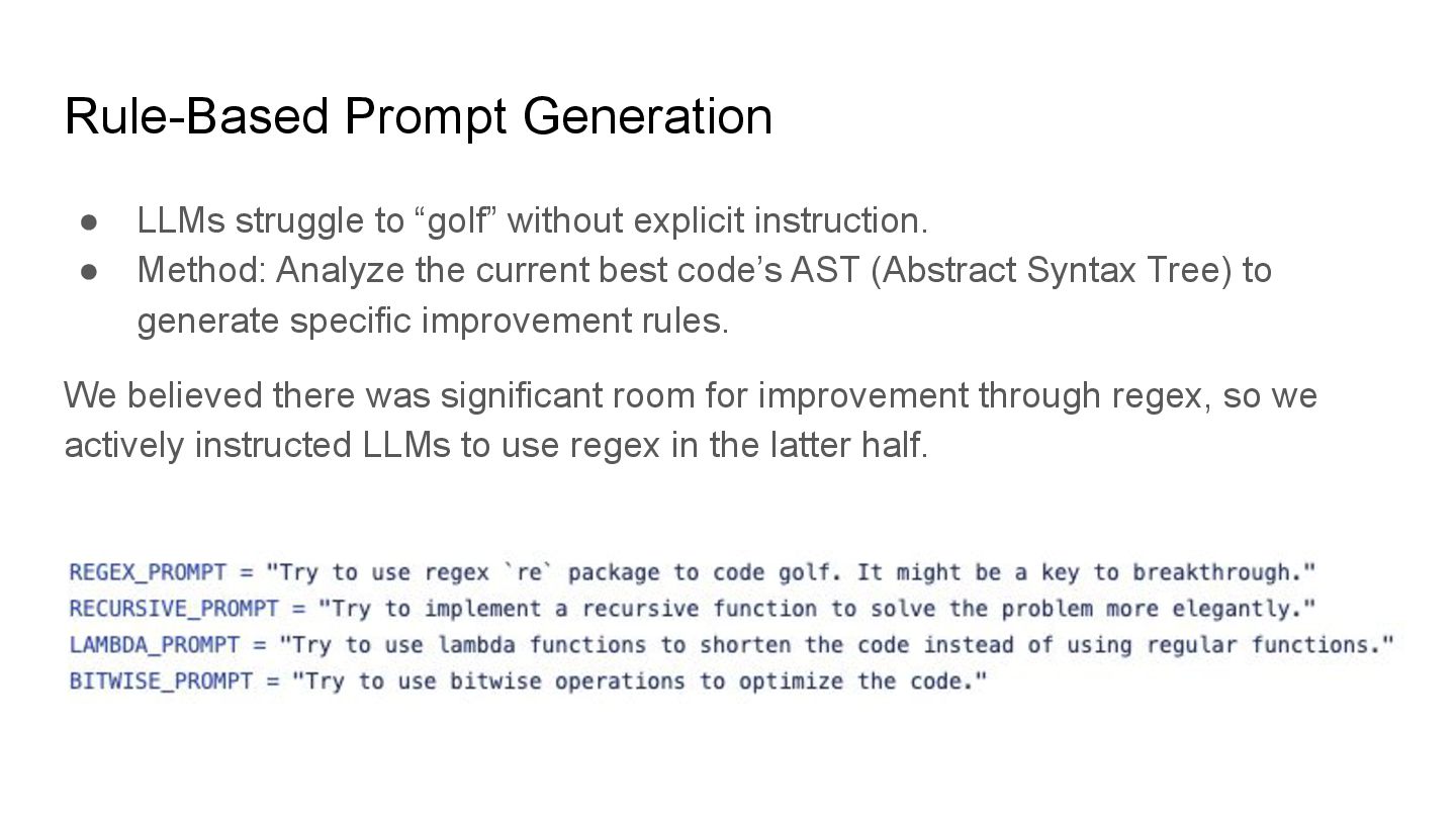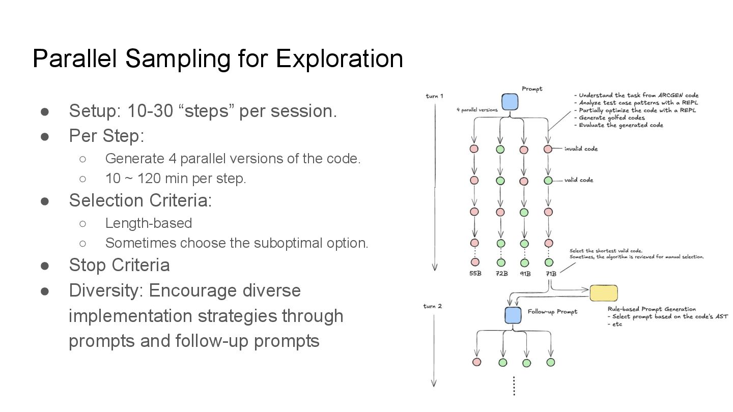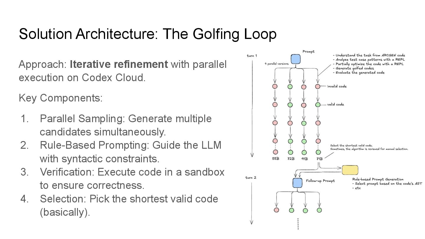 tasks (Abstract Reasoning Corpus) using Python. Constraint: Minimize source code length (bytes). Metric: • Per Task: Score = max(1, 2500 - Length) for correct solutions. • Final Ranking: Determined by the Cumulative Score across 400 tasks. Key Difficulty: • LLMs typically prioritize readability and explanation, not extreme brevity (Code Golf). • It's okay to solve it manually. Can LLM/AI agents beat professional golfers?