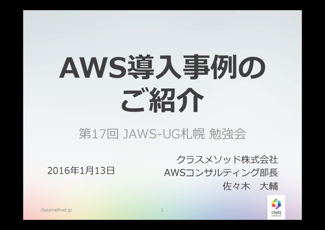AWS導⼊入事例例の ご紹介 第17回 JAWS-‐‑‒UG札幌 勉強会 classmethod.jp 1 2016年年1⽉月13⽇日 クラスメソッド株式会社 AWSコンサルティング部⻑⾧長
