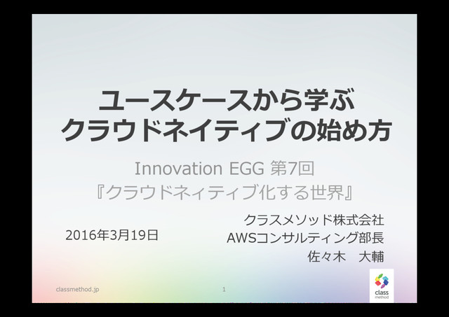 ユースケースから学ぶ クラウドネイティブの始め⽅方 Innovation EGG 第7回 『クラウドネィティブ化する世界』 classmethod.jp 1 2016年年3⽉月19⽇日